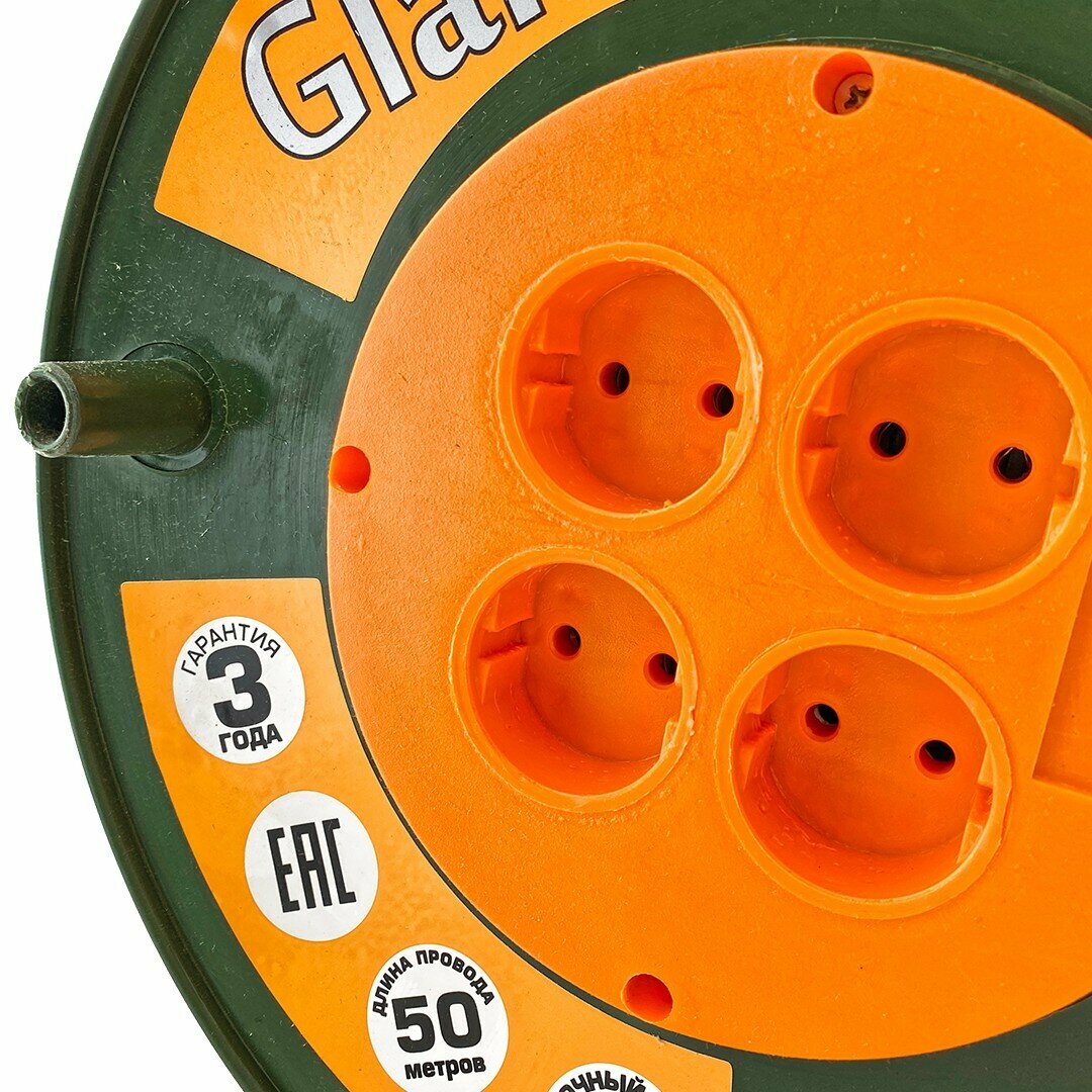 Удлинитель силовой на катушке GLANZEN 50м без зазем. 4 гнезда ПВС 2х1 мм ЕВ-50-003 для газонокосилки и триммера