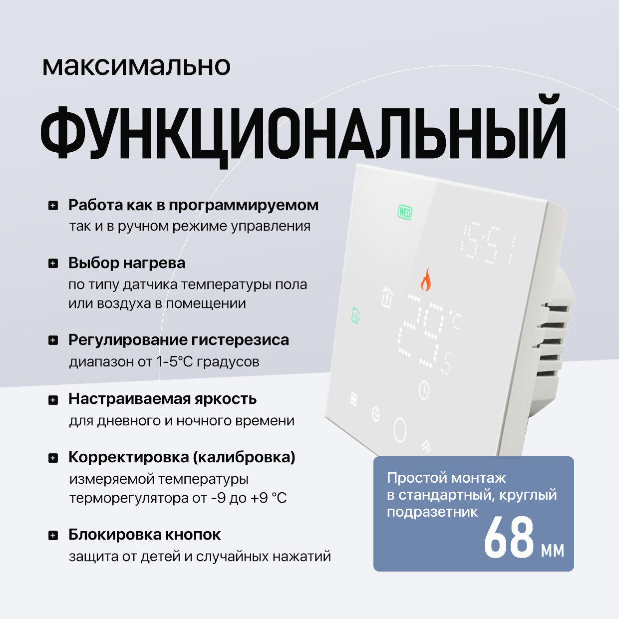 Удобно, что издает звук при включении теплого пола. Хорошая цена. |