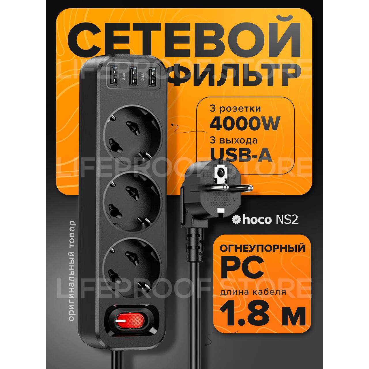 Удлинитель сетевой HOCO NS2, 3 гнезда 10 A, 1,8 м с 3-мя USB, черный электротовар
