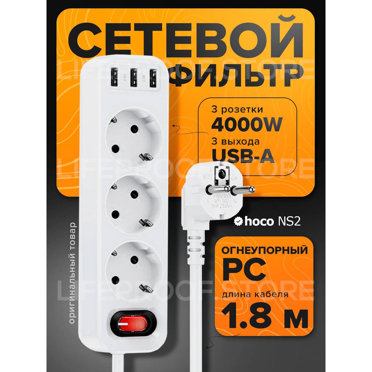 Удлинитель сетевой HOCO NS2, 3 гнезда 10 A, 1,8 м с 3-мя USB, черный электротовар