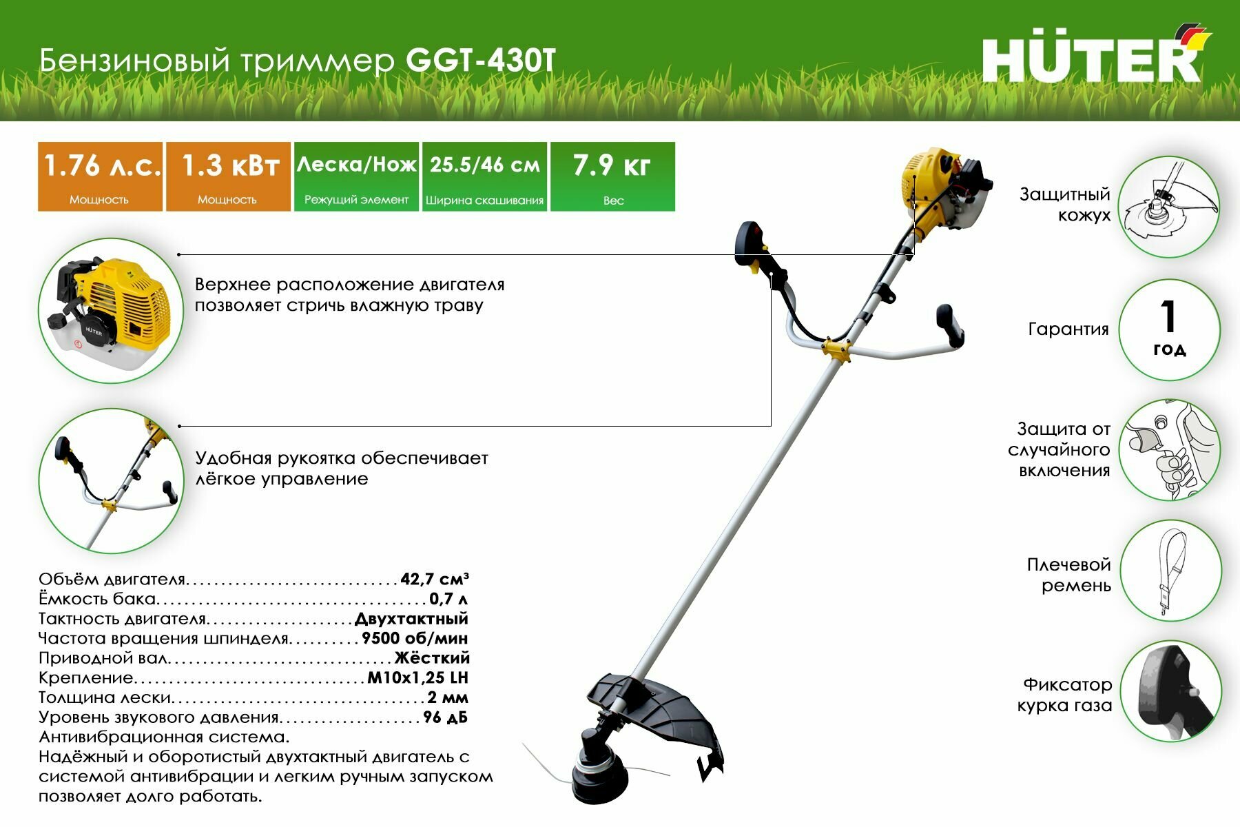 Триммер бензиновый HUTER GGT-430Т (1300 ВТ)