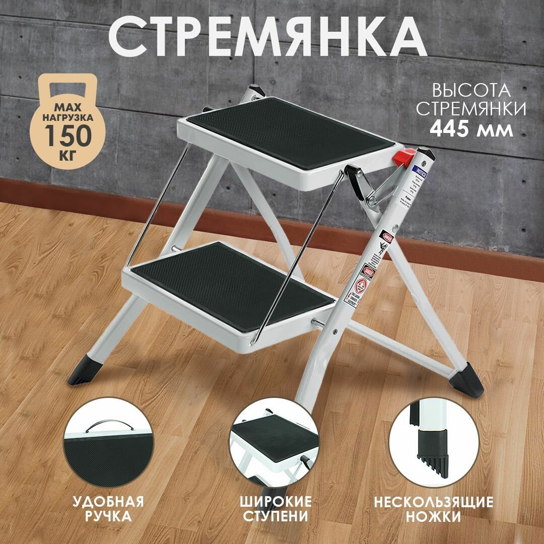 Стремянка лестница 2 ступени стальная складная для дома, кухни, садовая (76х37х35 см) с широкими ступенями
