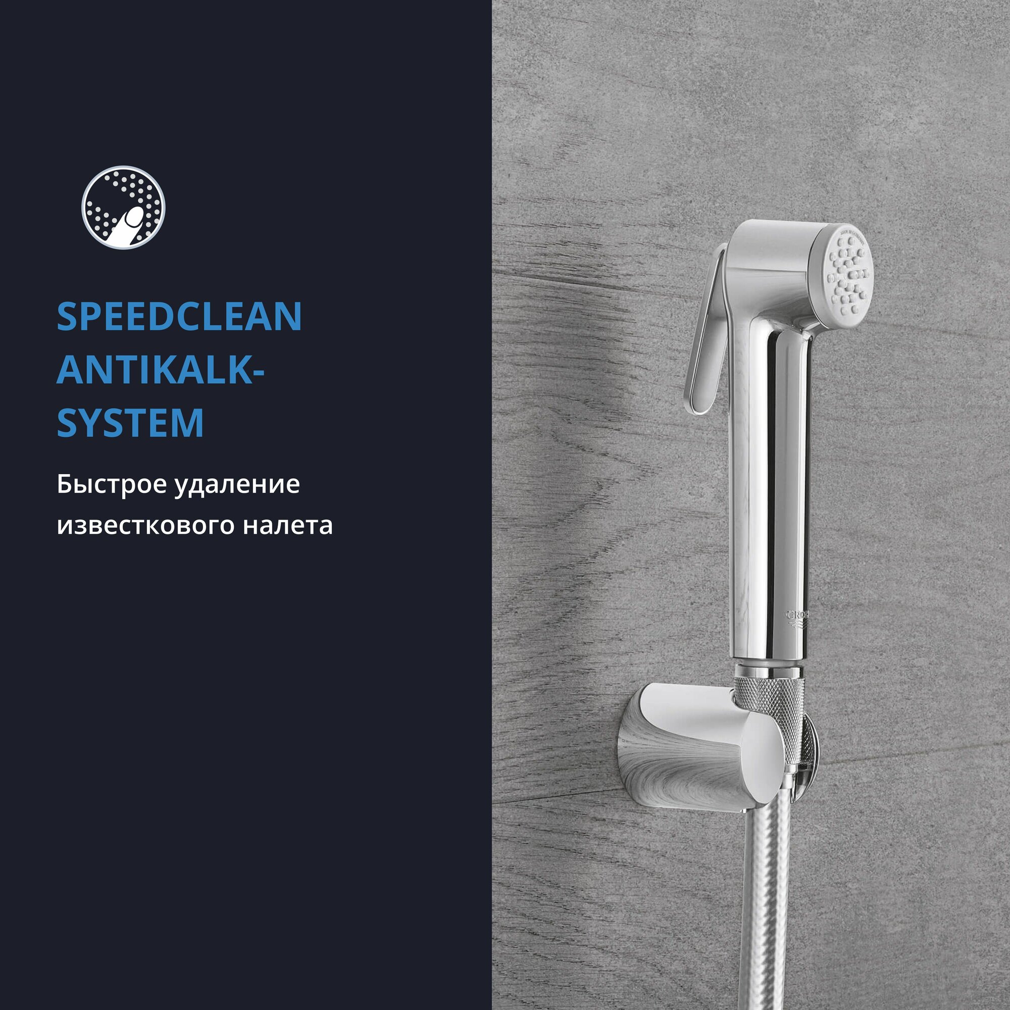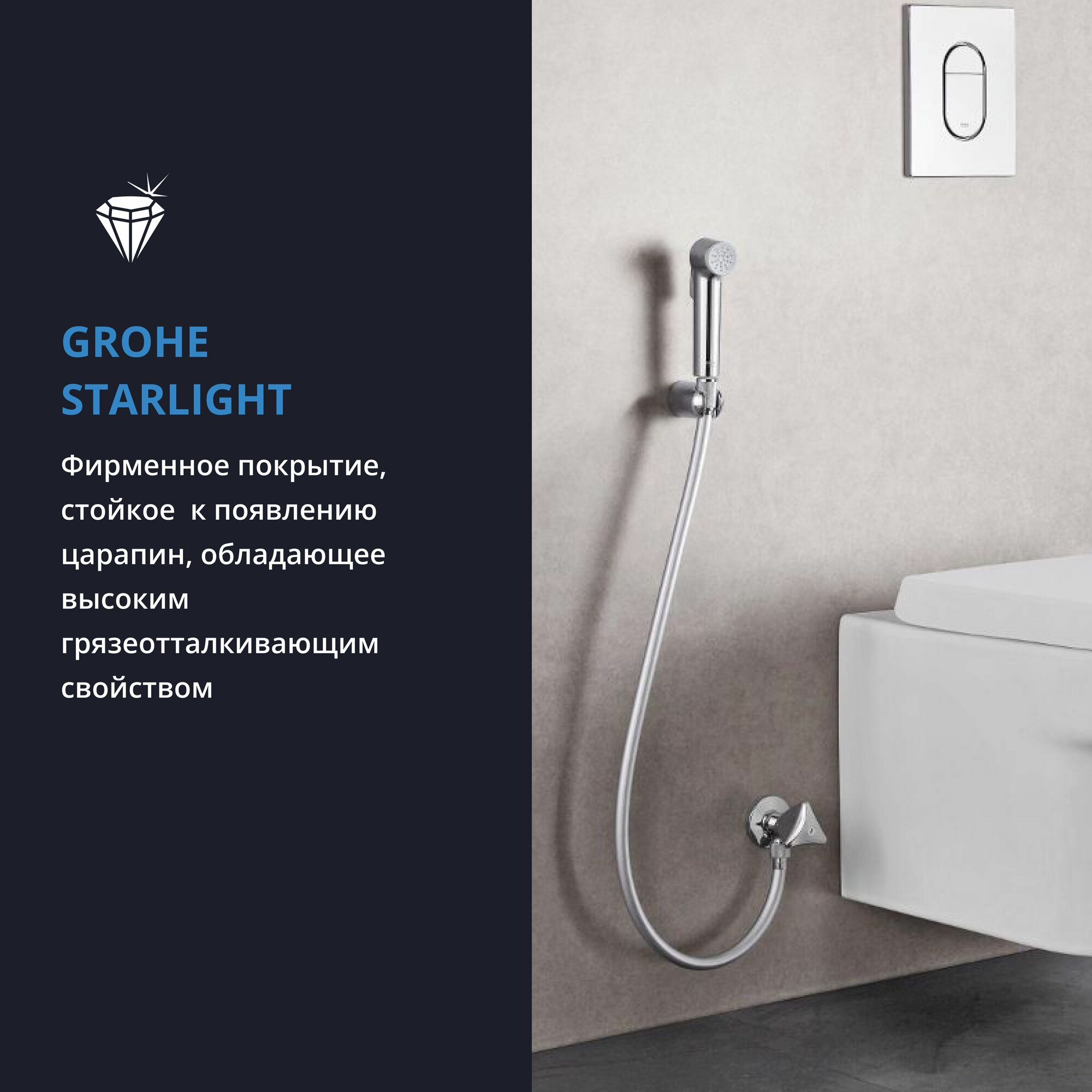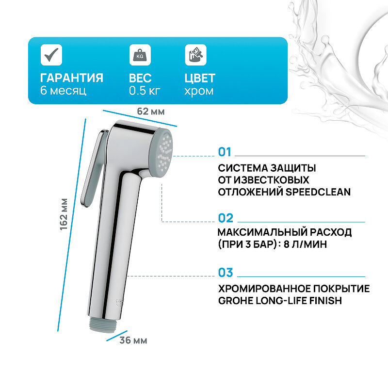 | Плюсы: | Лейка компактная, красивая, четко фиксируется в двух положениях кнопки, не маркий хром, легко протереть. Легко установить. Grohe, одним словом. Для гигиенического душа отлично. |