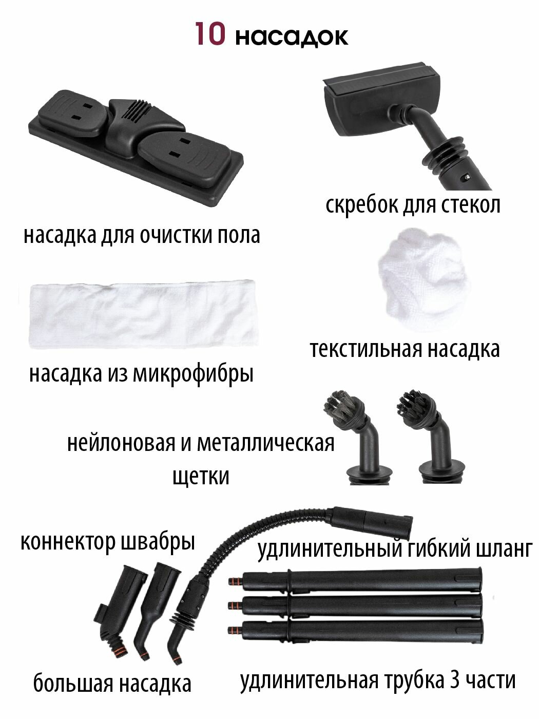 | Дополнительная информация | время нагрева: 3 мин.; комплектация: пароочиститель, воронка, мерный стакан, текстильная насадка, скребок для очистки стекол и зеркал, большая насадка, удлинительный гибкий шланг, нейлоновая щетка, металлическая щетка, швабра, коннектор швабры, удлинительная трубка из 3 частей, текстильная насадка для швабры, гарантийный талон, инструкция на русском языке |