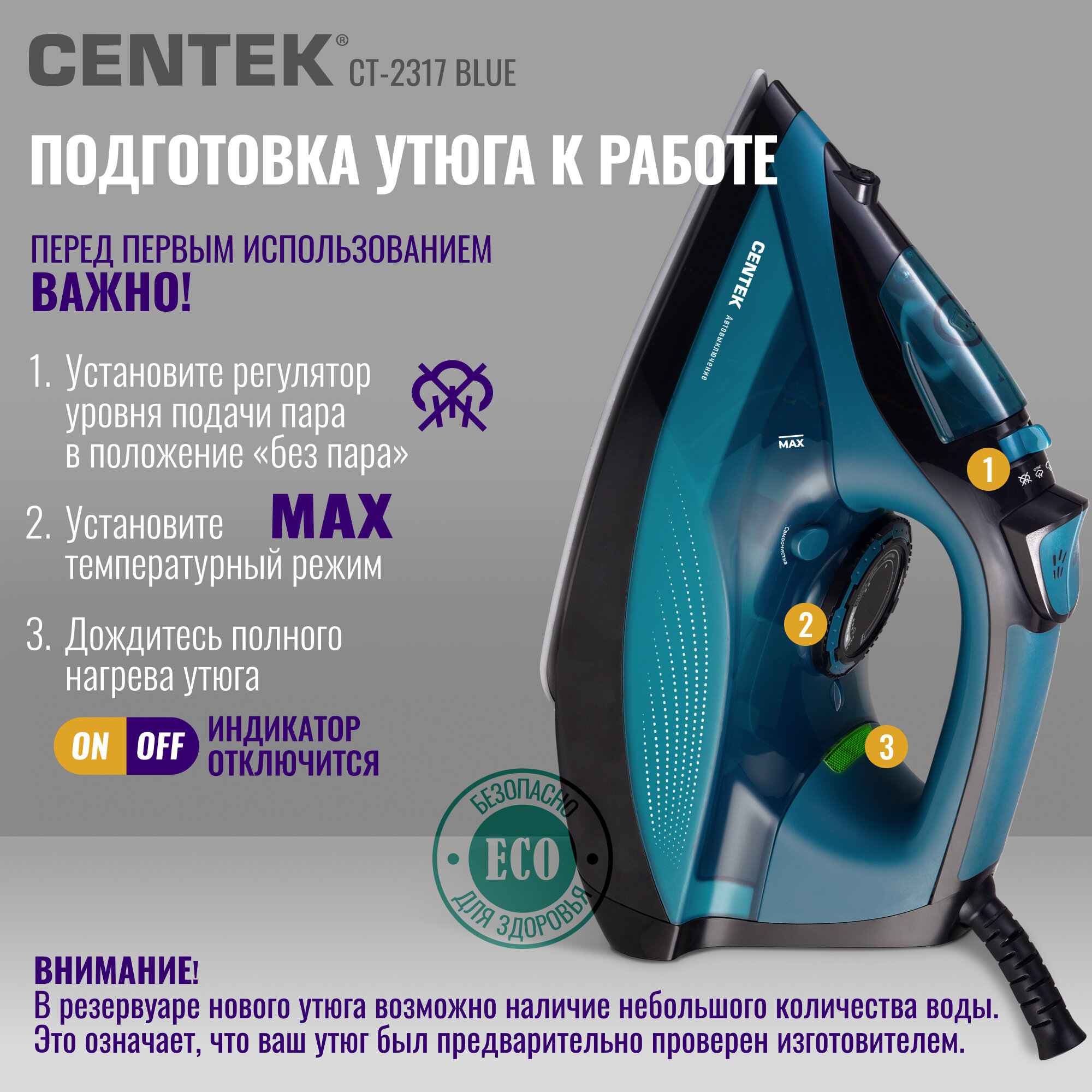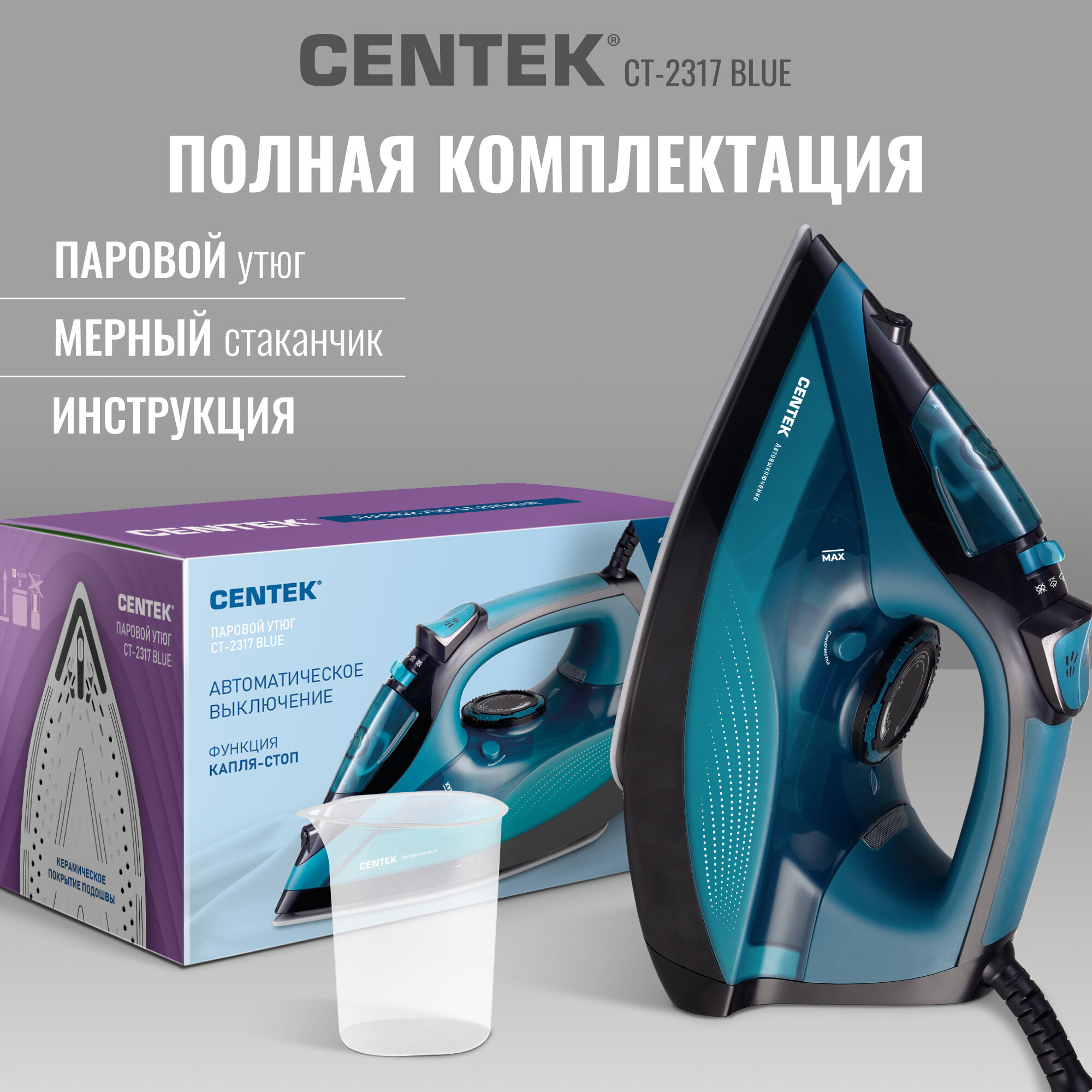 Купить Утюг CENTEK CT-2317 Blue: 2800Вт, керамическая подошва, паровой удар, защита от накипи, автовыключение