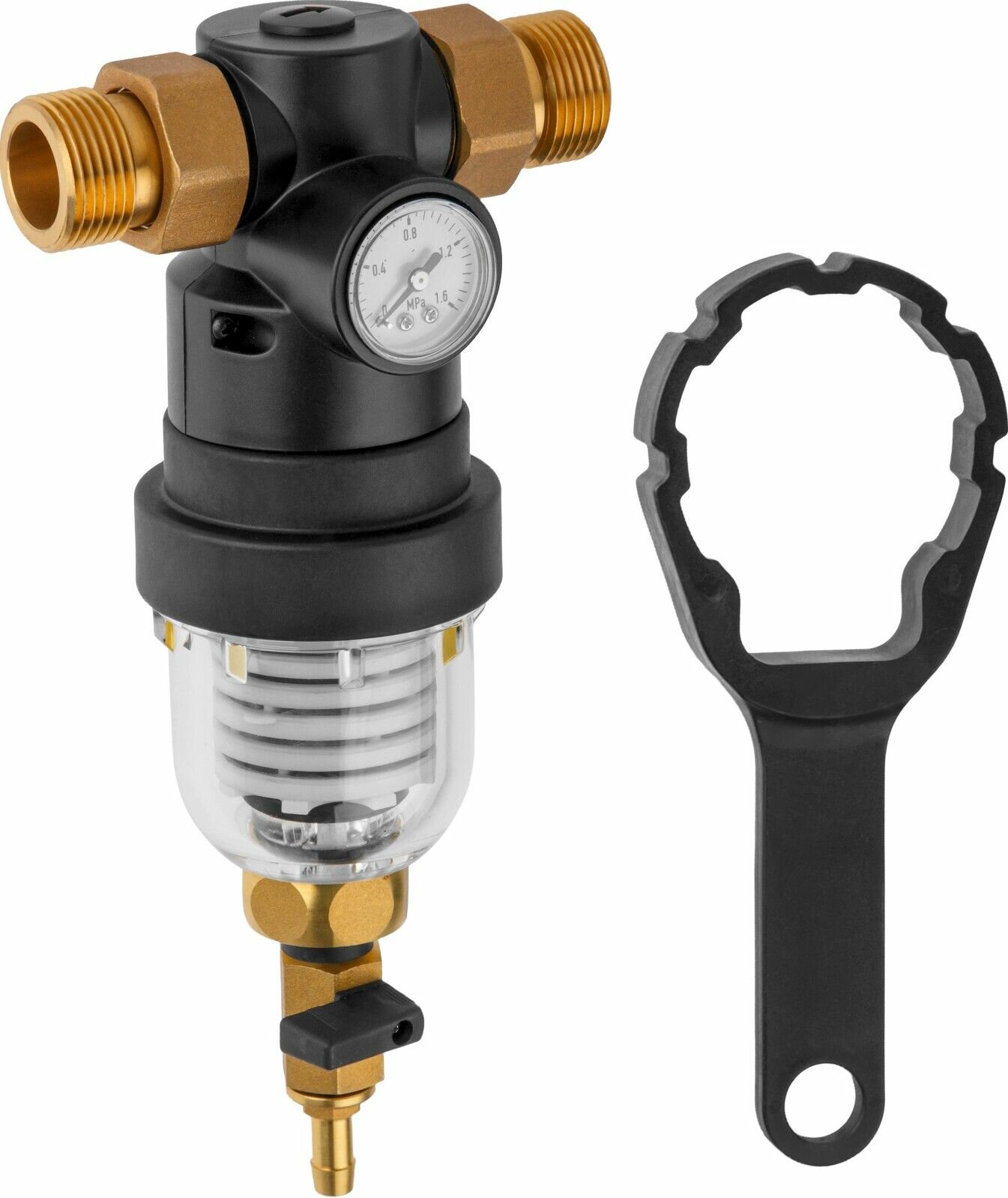 Магистральный фильтр для горячей воды самоочищающийся промывной латунный 1/2", 100 микрон, с манометром AV Engineering (AVE115701)