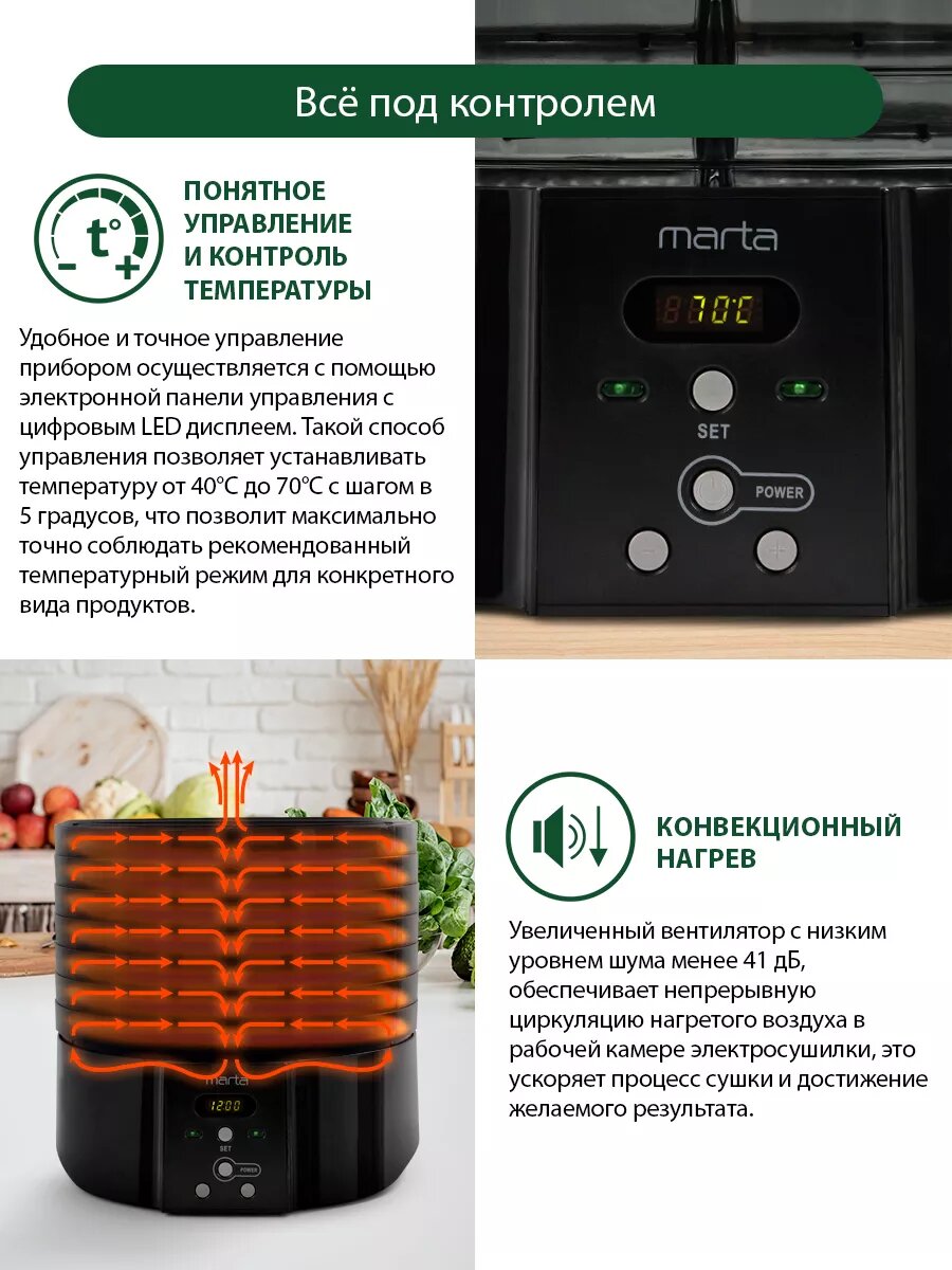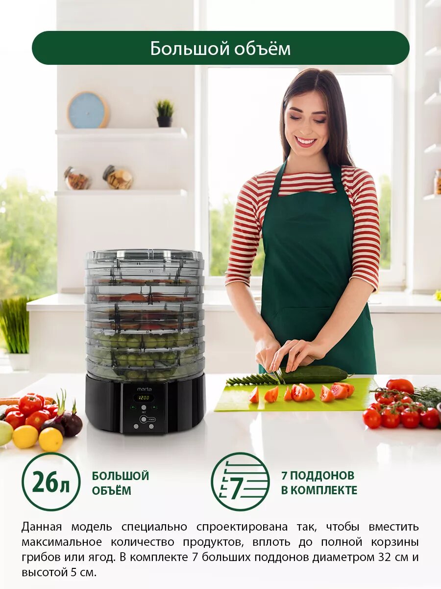 MARTA MT-FD1886G 13 поддонов-7+3 для пастилы+3 для ягод черный жемчуг сушилка д/фруктов,овощей