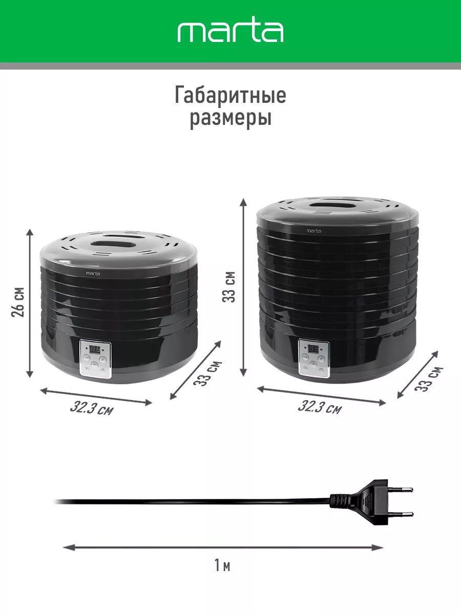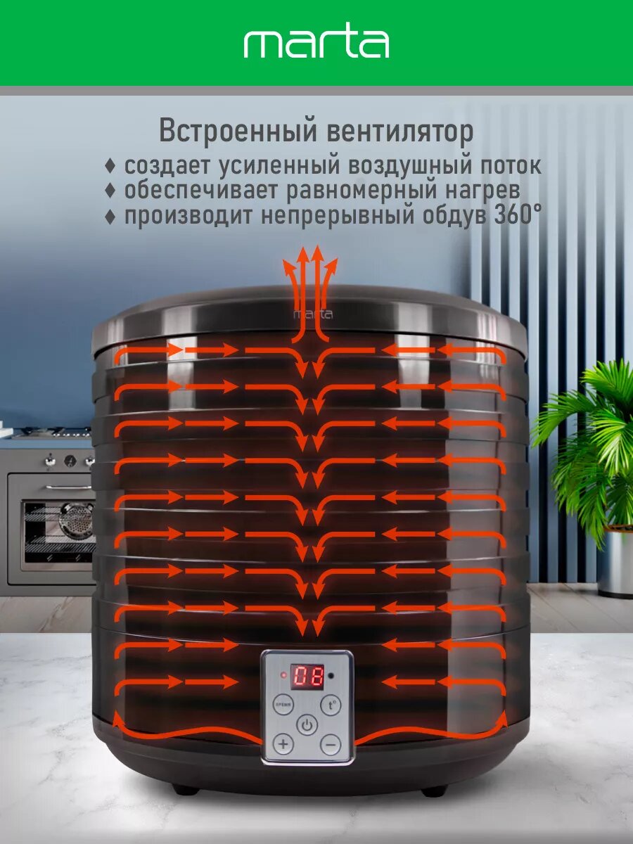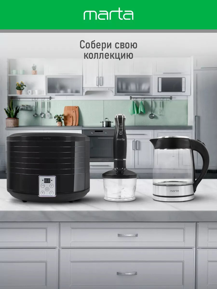 Дегидратор сушилка для овощей электросушилка MARTA MT-FD1888A 8 поддонов (4 основных + 2 для пастилы + 2 для ягод) черный