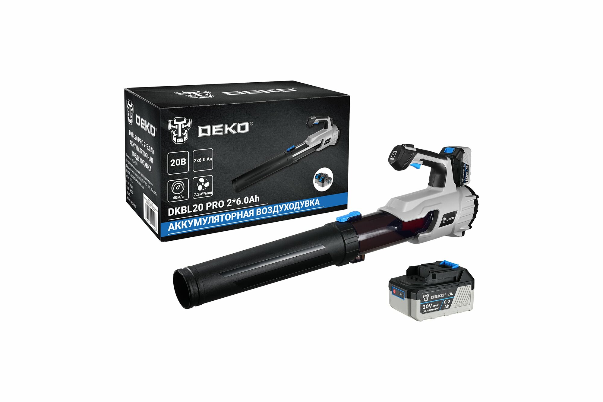 Купить Воздуходувка садовая аккумуляторная Deko DKBL20 PRO, 20В, 2х6.0Ач, черно-серый (063-4362)