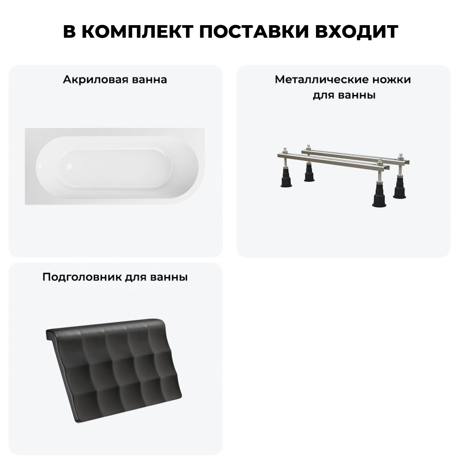 | Подробная комплектация | акриловая ванна Art II 170x72,5 см; усиленные металлические ножки с монтажным набором Complement; мягкий силиконовый подголовник; инструкция по монтажу и эксплуатации; гарантийный талон. |