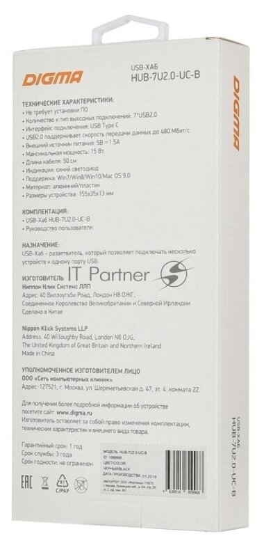 Купить Разветвитель USB-C Digma HUB-7U2.0-UC-B 7 портов, черный