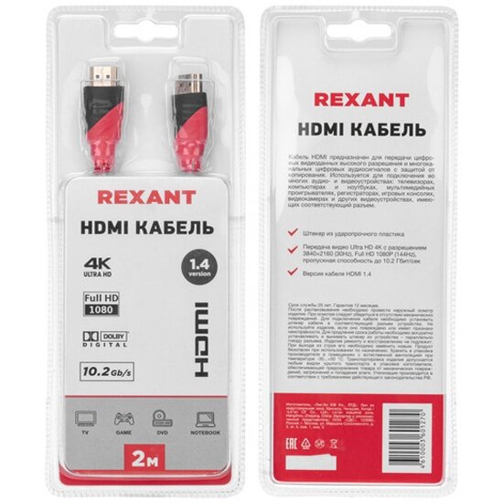 СохранитьКабель Rexant HDMI-HDMI 1.4, серия Gold, 2 метра (Ultra HD 4K, FHD) интересное: