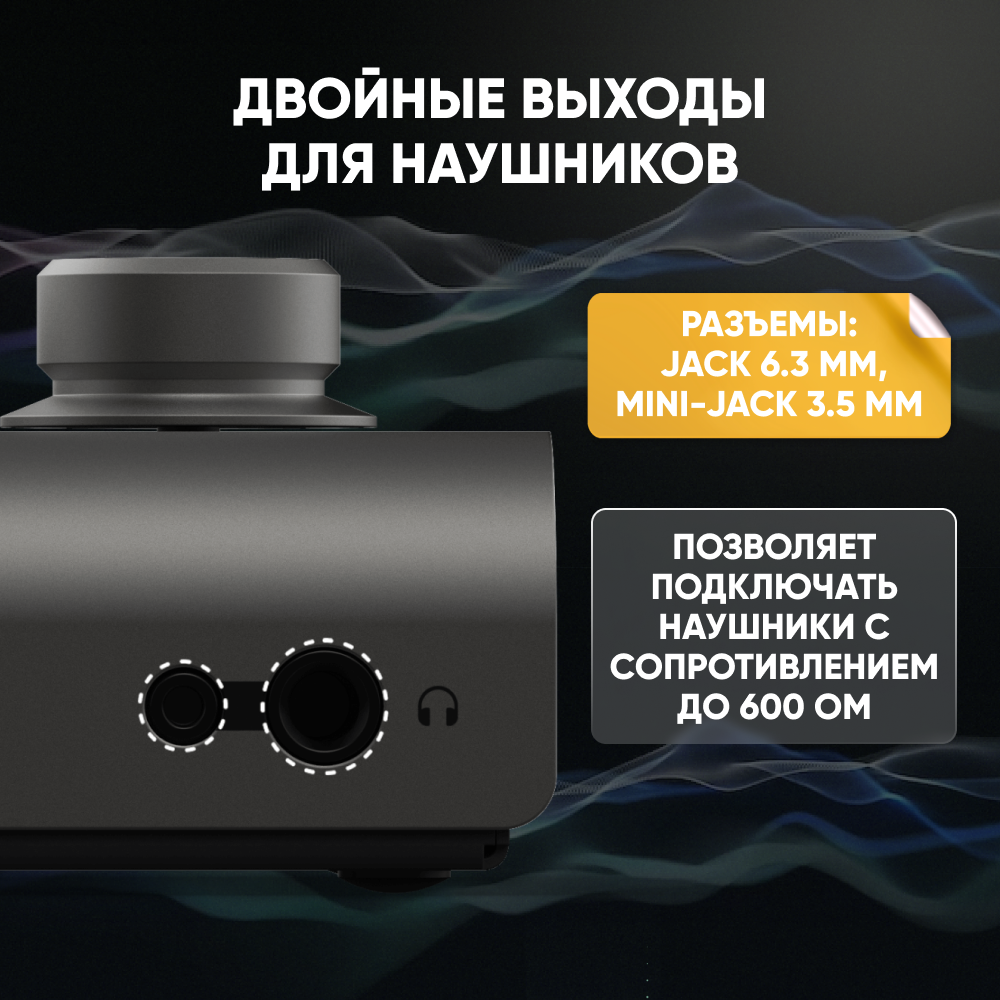 | Минусы: | Не хватает отдельно регулируемого мониторинга звука для наушников. Большое колесико справа регулирует одновременно и микрофон и компьютер. |