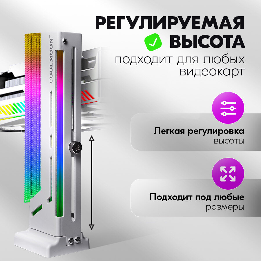 Вертикальный держатель COOLMOON (кронштейн) видеокарты NVIDIA GeForce RTX, GTX, Quadro, AMD Radeon, ASUS, GIGABYTE и др, планка с подсветкой, белый