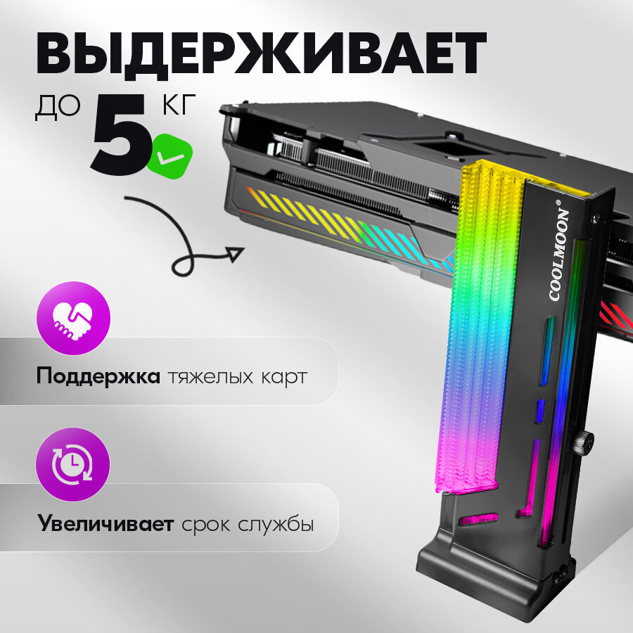 Держатель для видеокарты с подсветкой COOLMOON (вертикальный кронштейн) видеокарты NVIDIA GeForce RTX, GTX, AMD, RX, ASUS, GIGABYTE, Intel, черный