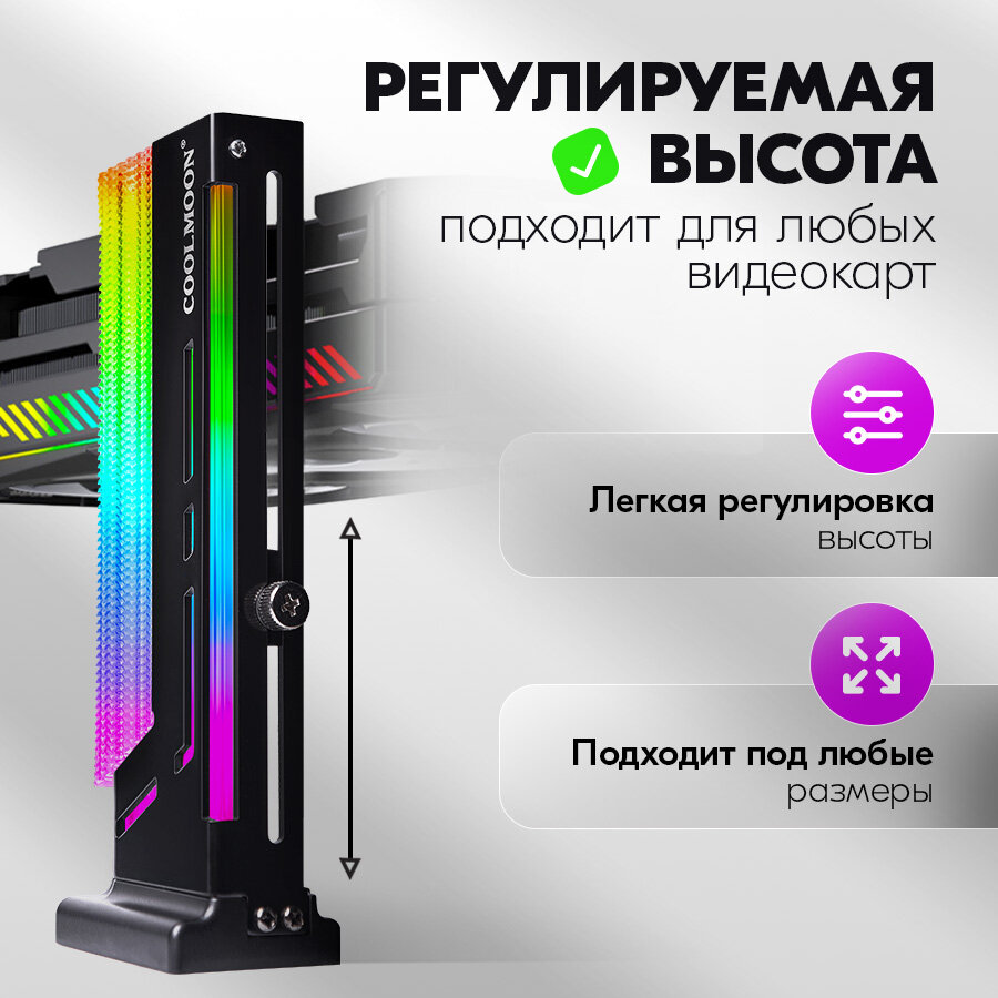 Вертикальный держатель COOLMOON (кронштейн) видеокарты NVIDIA GeForce RTX, GTX, Quadro, AMD Radeon, ASUS, GIGABYTE и др, планка с подсветкой, черный