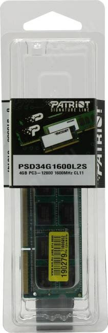 Оперативная память Patriot PSD34G1600L2S DDR3L - 4ГБ 1600, SO-DIMM, Ret