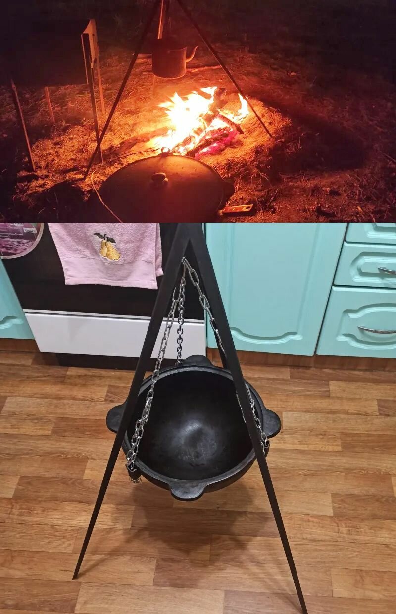 | Плюсы: | Удобно складывается, имеет встроенный крючок для котла.
