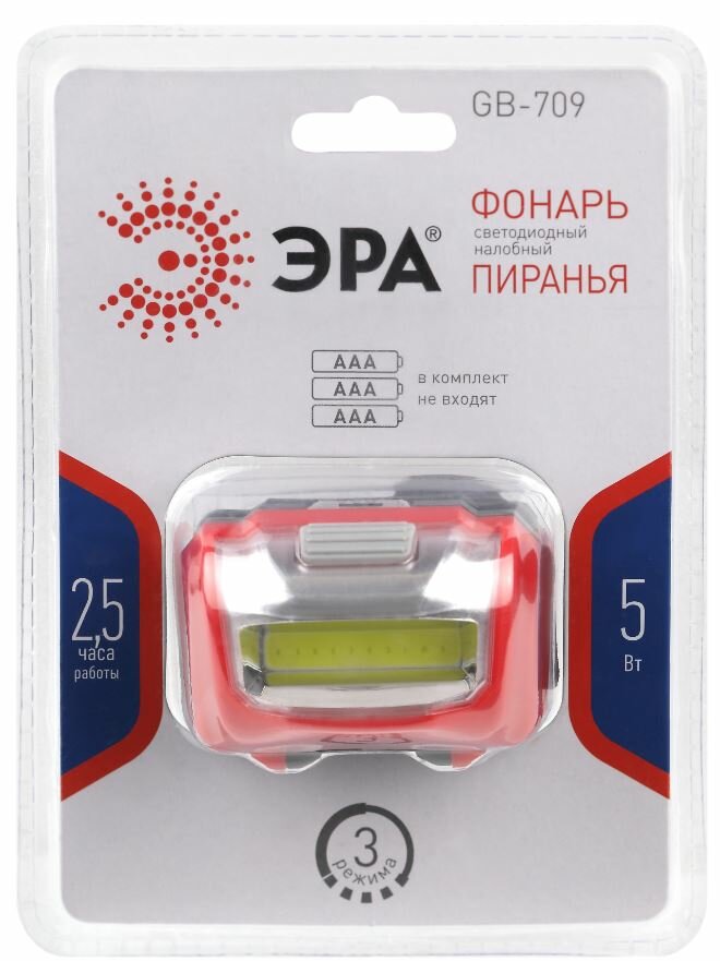 Фонарь налобный светодиодный ЭРА GB-709 Пиранья, на батарейках, 3 режима 5 Вт, СОВ, 3хААА