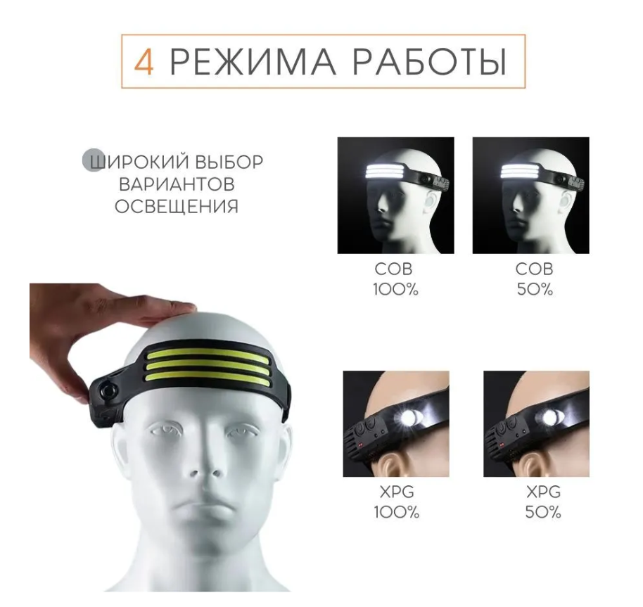 режимы: СОВ светильник, регулировка яркости, стробоскоп