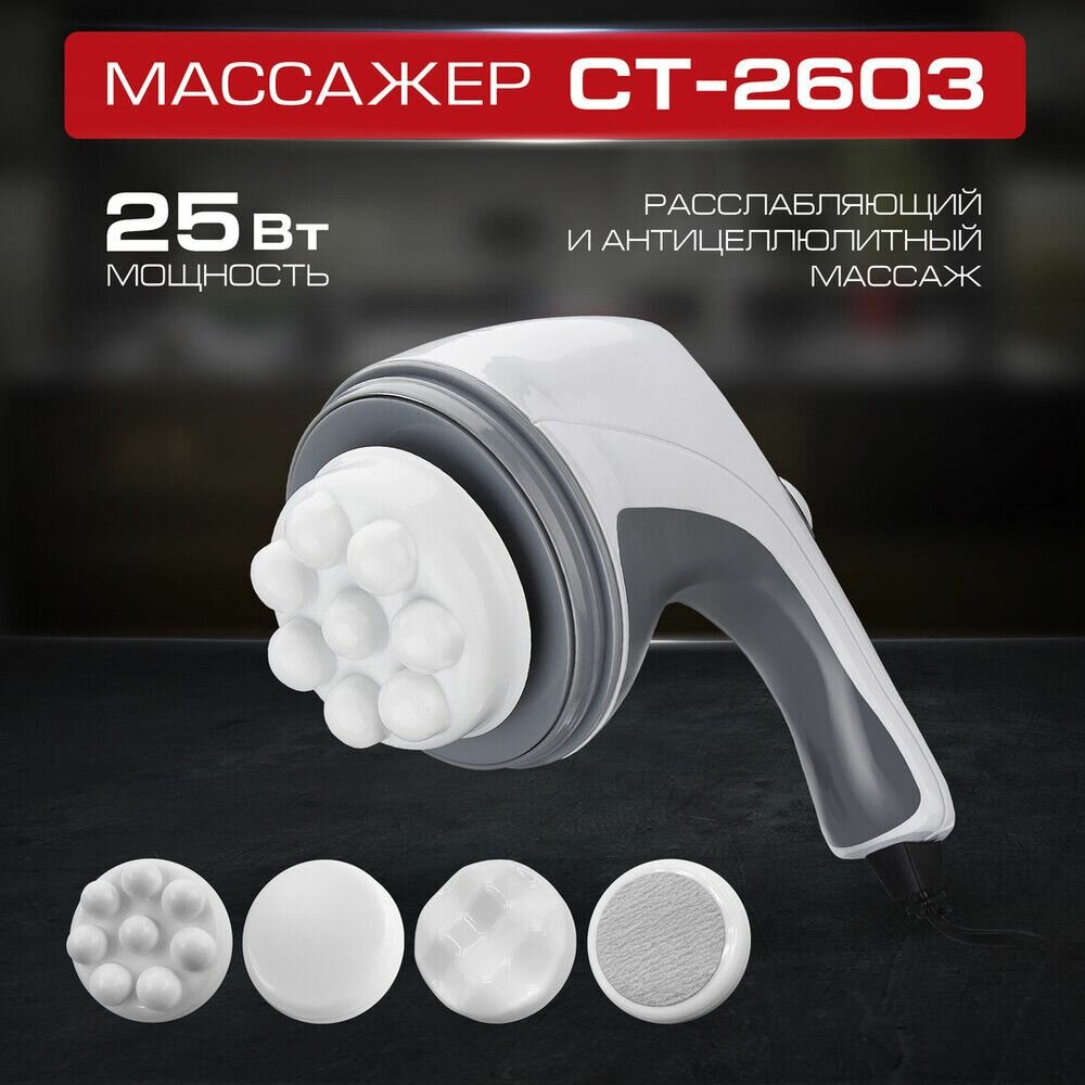 Массажёр для тела CT-2603, 25 Вт, 4 насадки, 7 режимов, вибрационный, серый