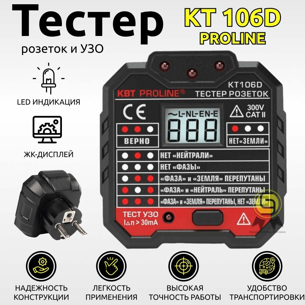 Тестер розеток и УЗО KT 106D серия PROLINE со светодиодной индикацией и ЖК-дисплей с указанием величины напряжения в сети, КВТ (79136)