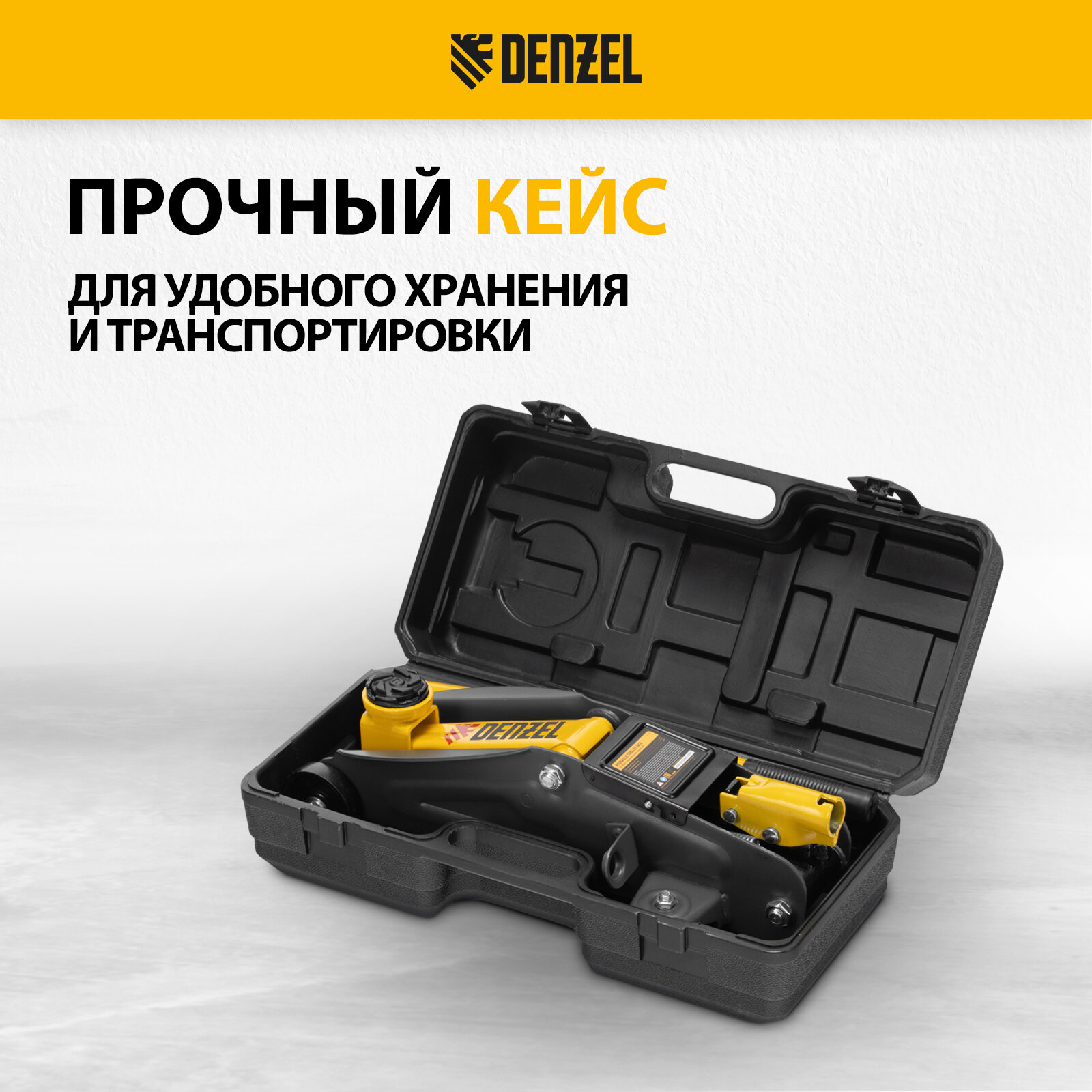 Домкрат гидравлический подкатной, 2 т, 135-385 мм, в пласт. кейсе Denzel