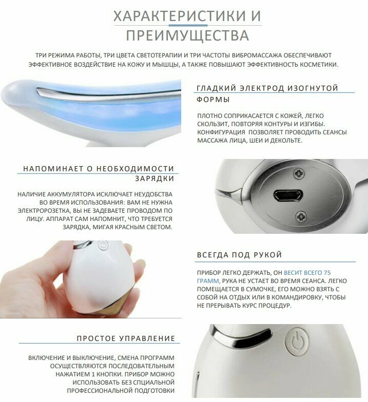 | Плюсы: | Очень хороший прибор для ухода за кожей. Пока непонятно насколько эффективный с точки зрения поддержания тонуса кожи, но при использовании прибора проявился неожиданный эффект. Была болезненность у зуба с удаленными нервами, она почти полностью ушла. Всего в приборе три режима работы. Каждый режим имеет свой уровень вибрации, теплового и светового воздействия. Синий цвет самый холодный и предназначен скорее для антисептической обработки кожи. Красный самый теплый, по идее должен стимулировать выработку коллагена и возвращать коже упругость. Очень хорошо снимает отёки вокруг глаз, надо только немного приноровиться, т.к. прибор активируется от соприкосновения с кожей, а форма как видно на фото у него своеобразная, но все возможно. На данный момент владею прибором уже месяц, о покупке однозначно не жалею, тем более, что купила с прибор с хорошей скидкой. Прибор заряжаю очень редко, аккумулятора хватает надолго. |