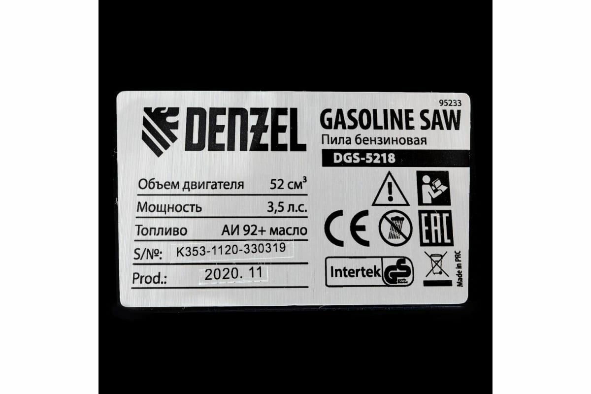 Купить DENZEL 4044996172606 DENZEL 95233 Пила цепная бензиновая DGS-5218, шина 45 см, 52см3, 3,5 л.с. Пила цепная