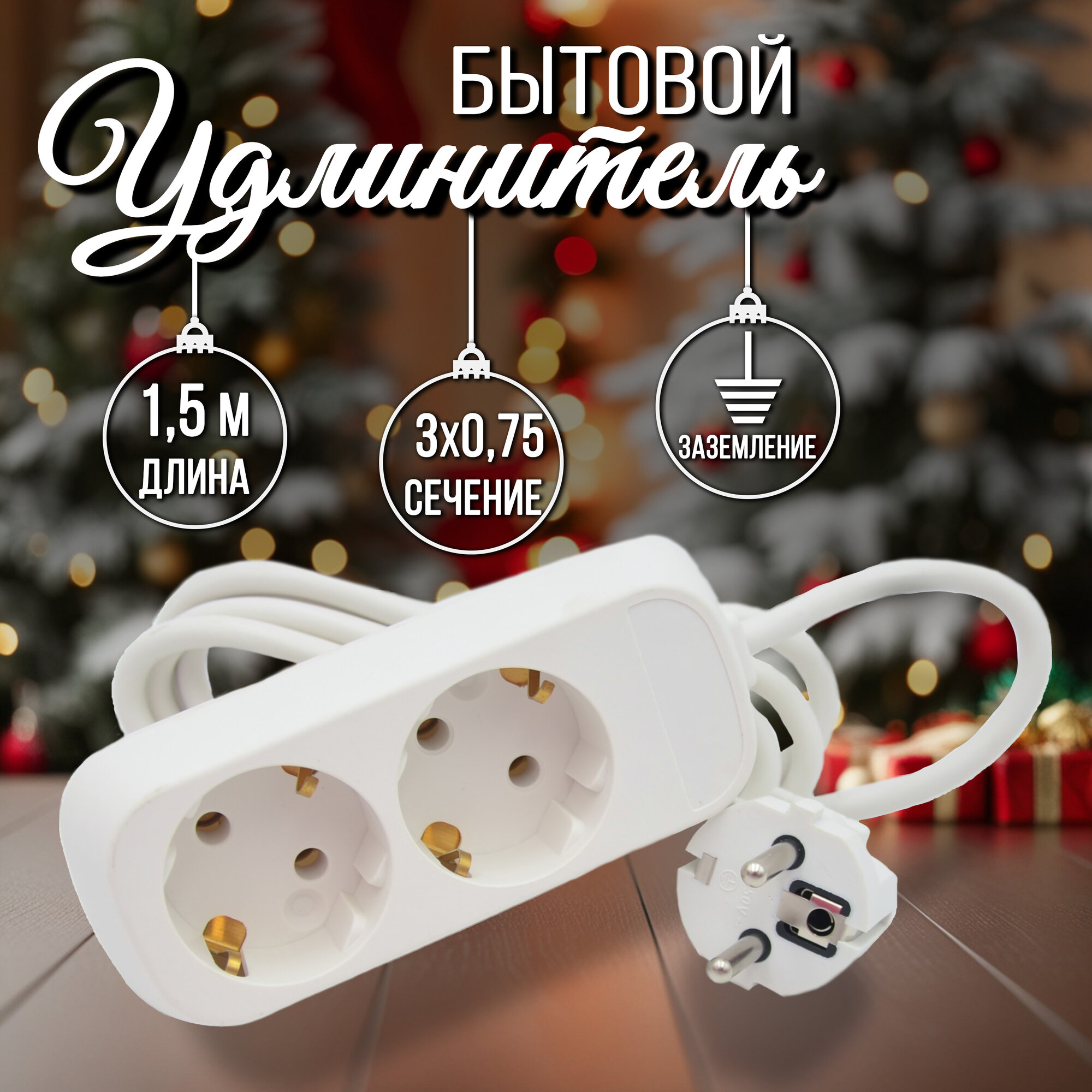 Удлинитель 1,5 метра, 3х0,75 мм, белый, сетевой с заземлением / 2 розетками, для электрооборудования, для дома и дачи FLIX