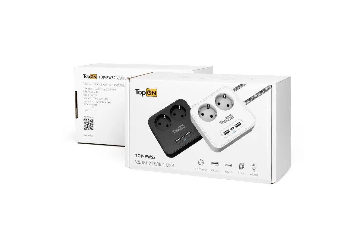 TopOn Сетевой фильтр TOP-PWS2 на 2 розетки с 2 USB-A и USB-C, 4000W, 1.5 м Черный TOP-PWS2B