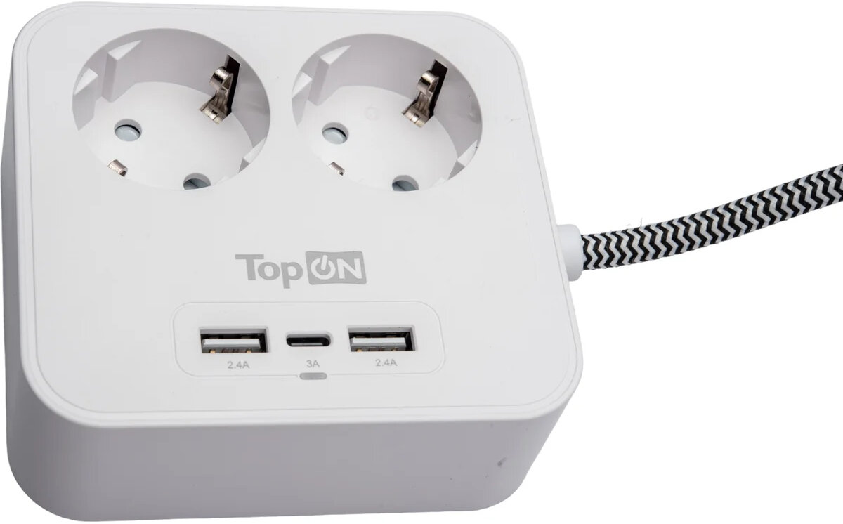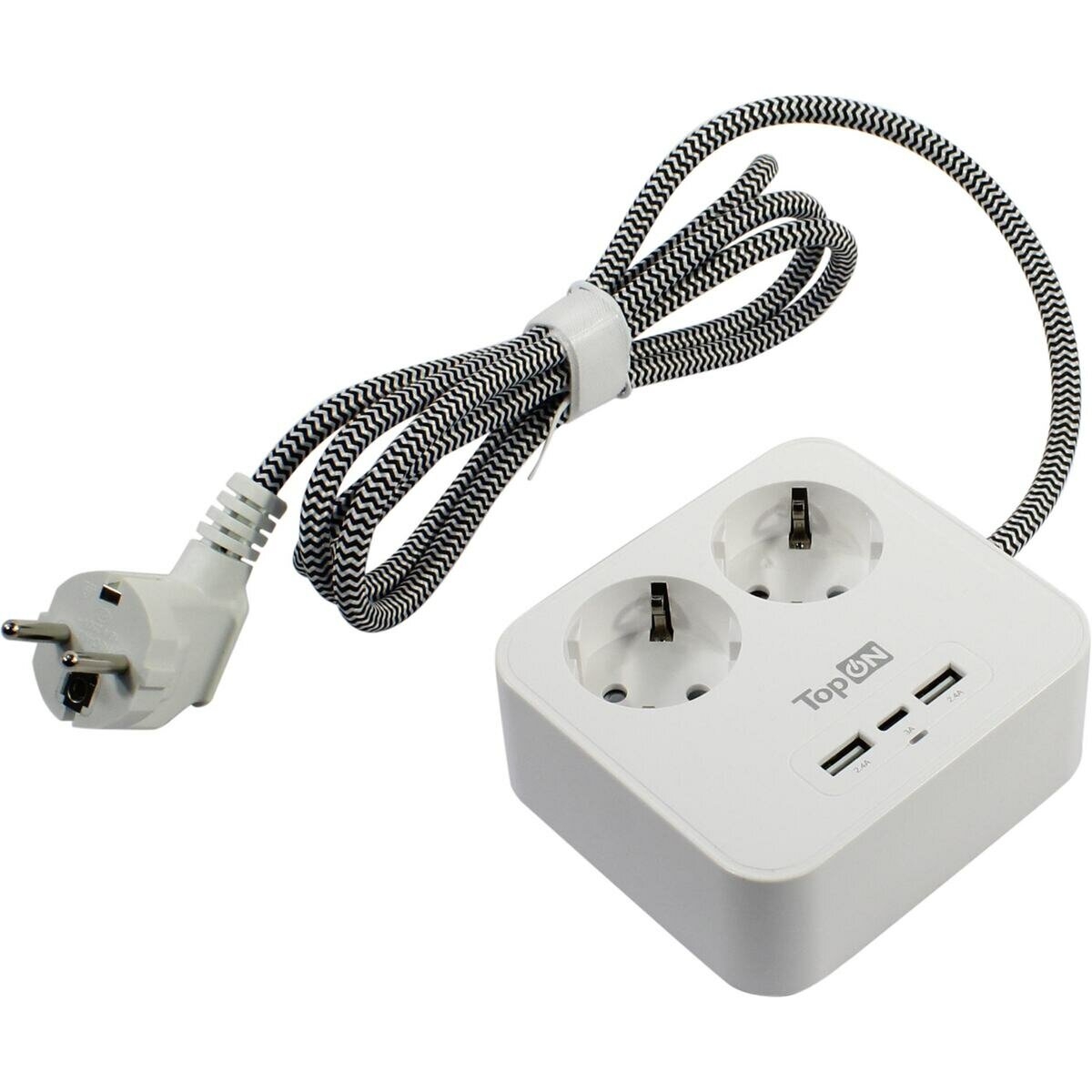 Сетевой фильтр TopON TOP-PWS2 на 2 розетки, с 2 USB-A и USB-C, 4000W, 1.5 м, белый