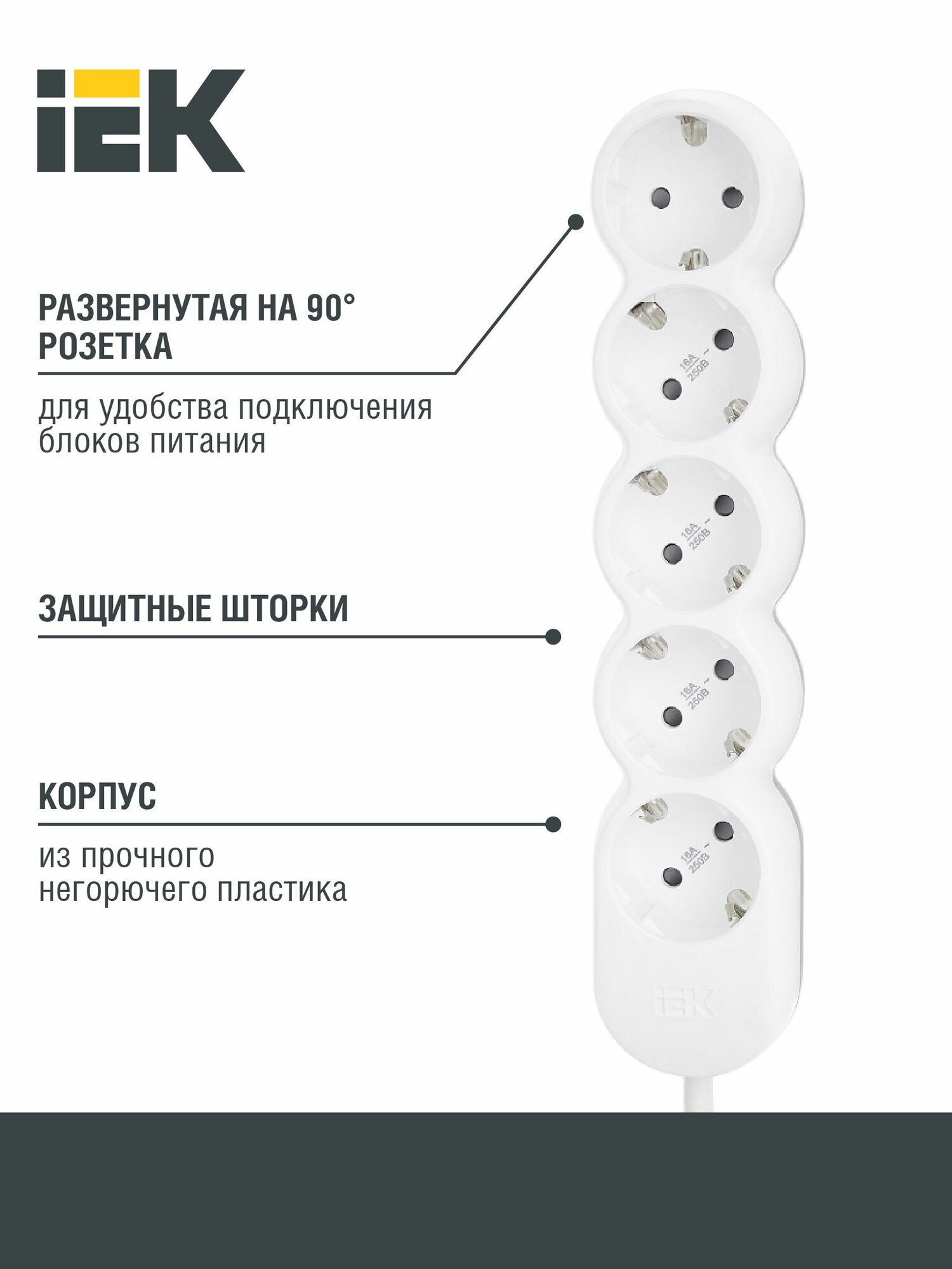 Удлинитель IEK WYP53-16-05-D15-ZK, 5 розеток, 1.5 м, с/з, 16А / 3500 Вт белый