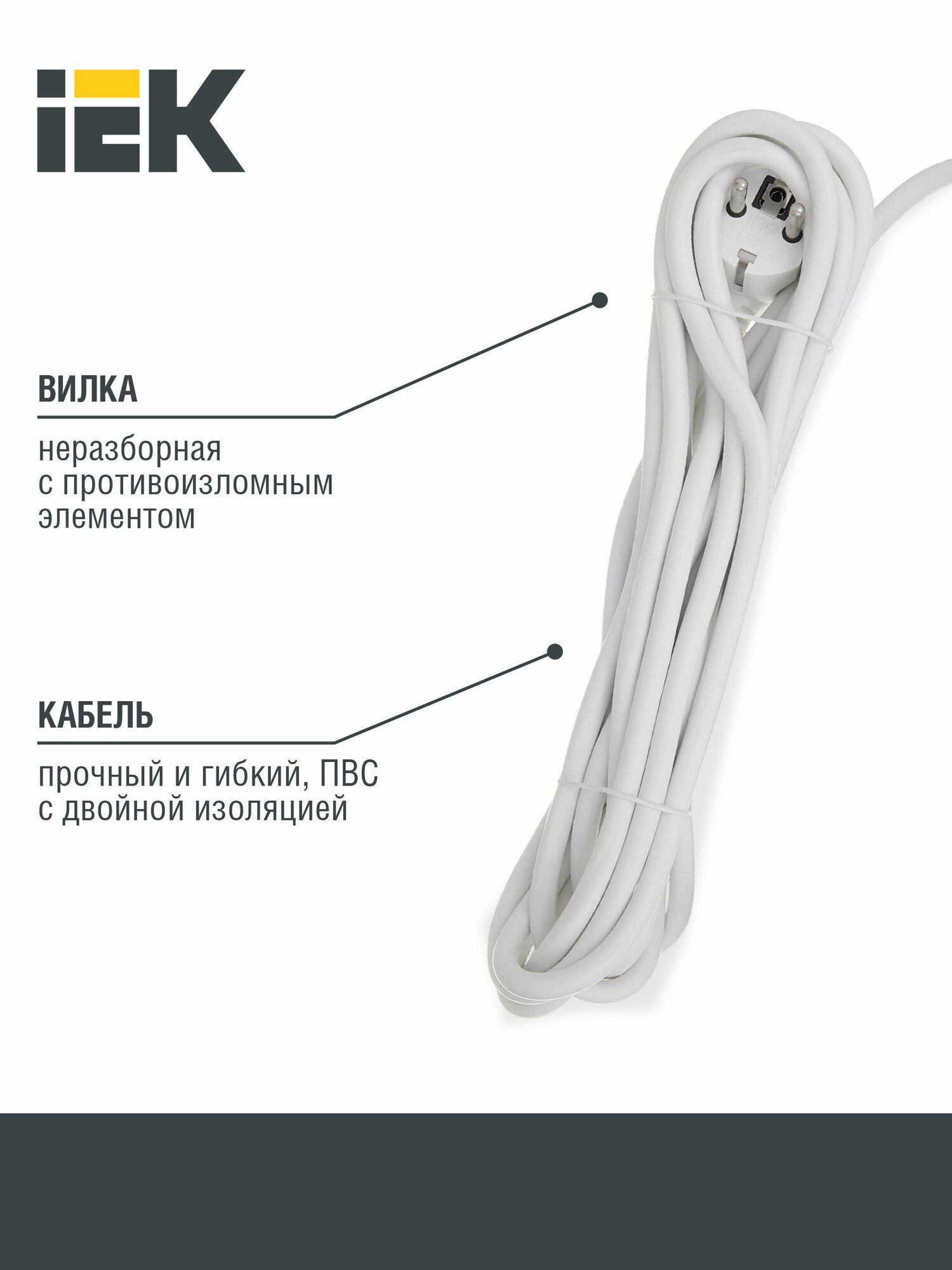 Удлинитель IEK Uno У05, ПВС 3 x 1,5 мм², с заземлением, 5 розеток, 5 м, белый