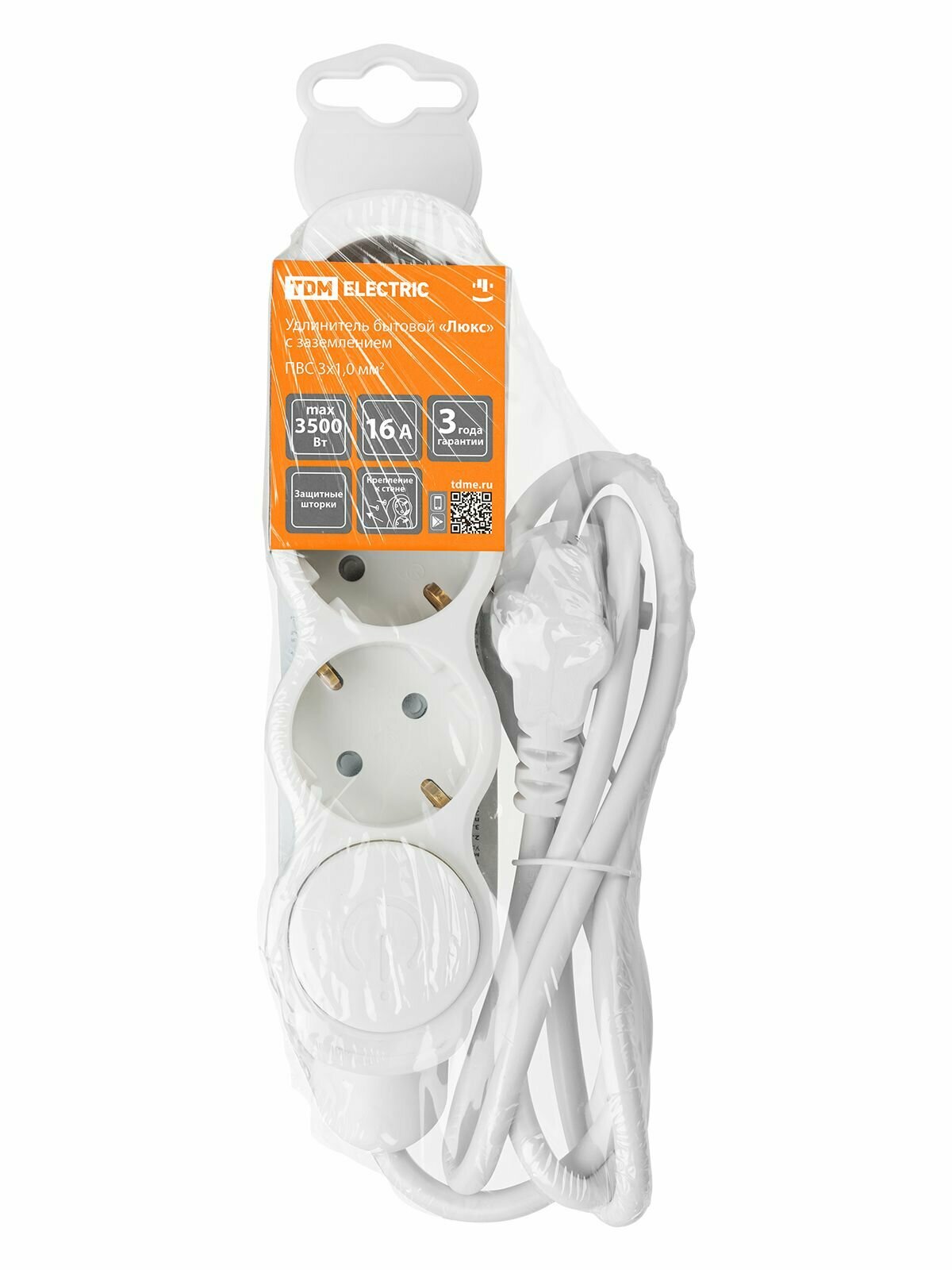 Удлинитель бытовой "Люкс" УЛ03В выкл, 3 гнезда, 3м, с заземлением, с защитными шторками, ПВС 3х1мм2 16А/250В бело-серый, TDM SQ1303-0131 (1 шт.)