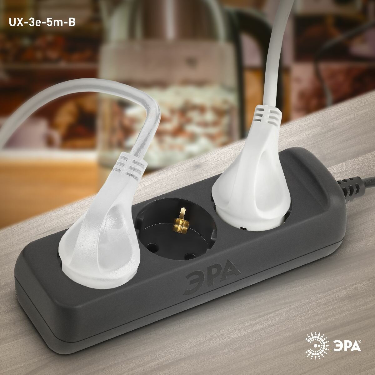 Удлинитель электрический UX-3e-5m-B с заземлением 3 розетки 5м ПВС 3x0,75мм2 10А черный, ЭРА Б0057723 (1 шт.)