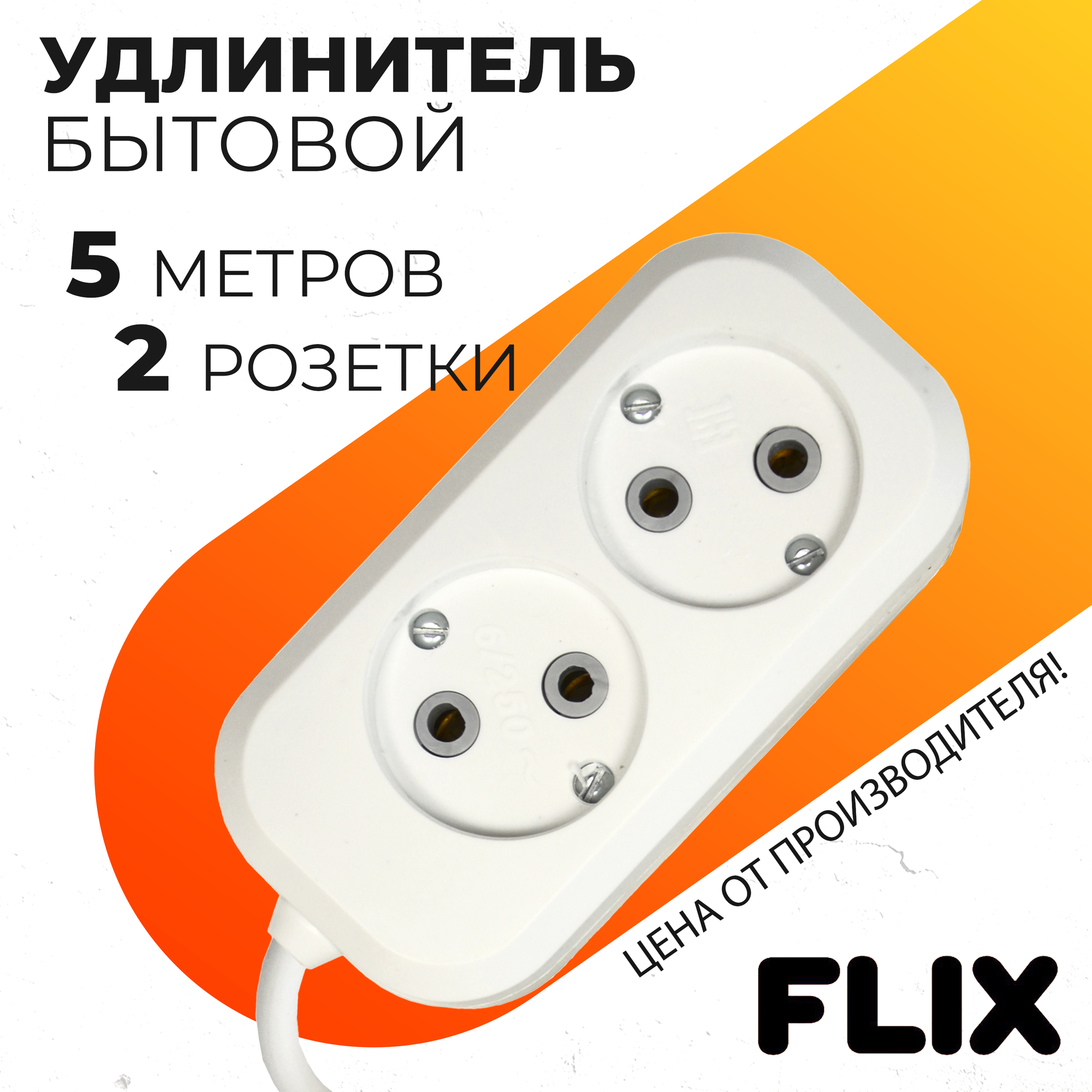Удлинитель FLIX 5 метров, 2 розетки, 2х0,75 мм, белый, сетевой без заземления для электрооборудования, для дома и дачи интересное: