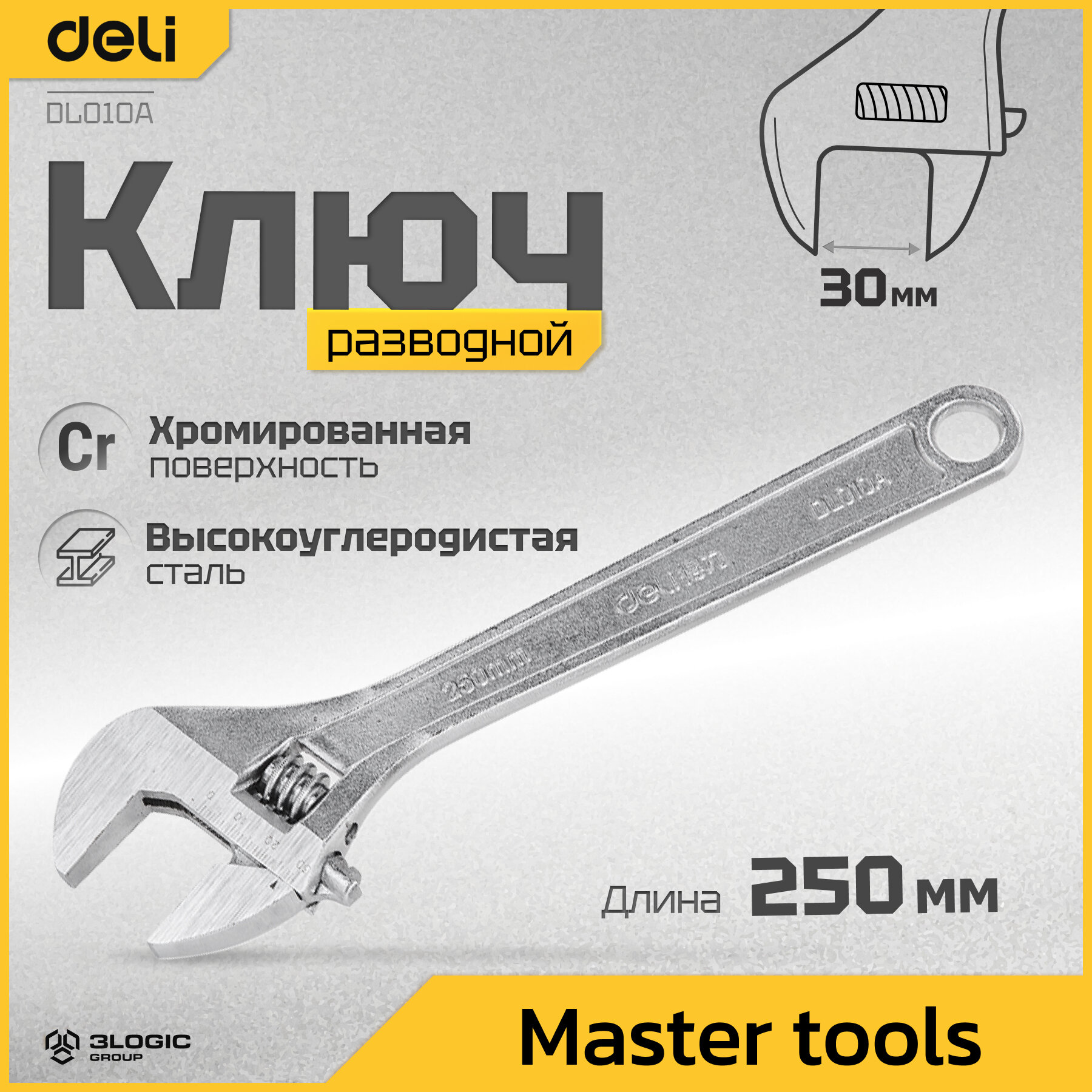 Ключ Deli Разводной 250мм, диапазон регулировки 0-30мм, инструментальная сталь, хромированная отделка