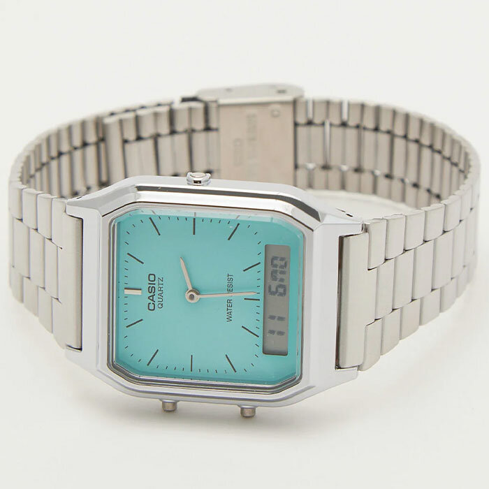 AQ-230A-2A2 Casio наручные часы кварцевые WR30 (3 атм) мужские, женские серебряный, бирюзовый секундомер будильник отображение числа, второй часовой пояс, отображение дня недели, отображение месяца акриловое стекло