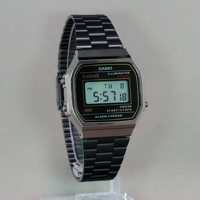 A168WEGG-1A Casio наручные часы кварцевые WR30 (3 атм) мужские, женские черный секундомер будильник отображение числа, отображение дня недели, отображение месяца подсветка дисплея акриловое стекло