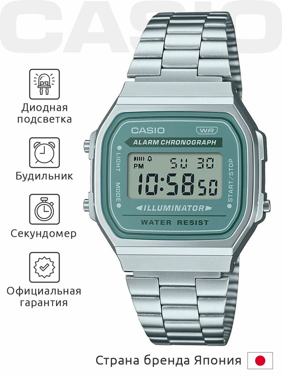 A168WA-8A Casio наручные часы кварцевые WR30 (3 атм) мужские, женские секундомер будильник отображение числа, отображение дня недели, отображение месяца подсветка дисплея акриловое стекло