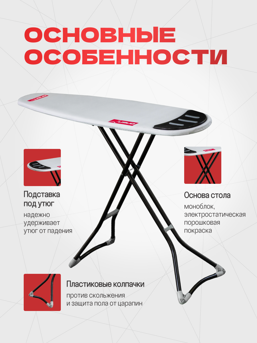 Удобная, практичная, ничего лишнего - все что надо от гладильной доски. Единственное что стоит учесть это размер: 1560х400мм в габаритах, для маленьких площадей может быть велика.