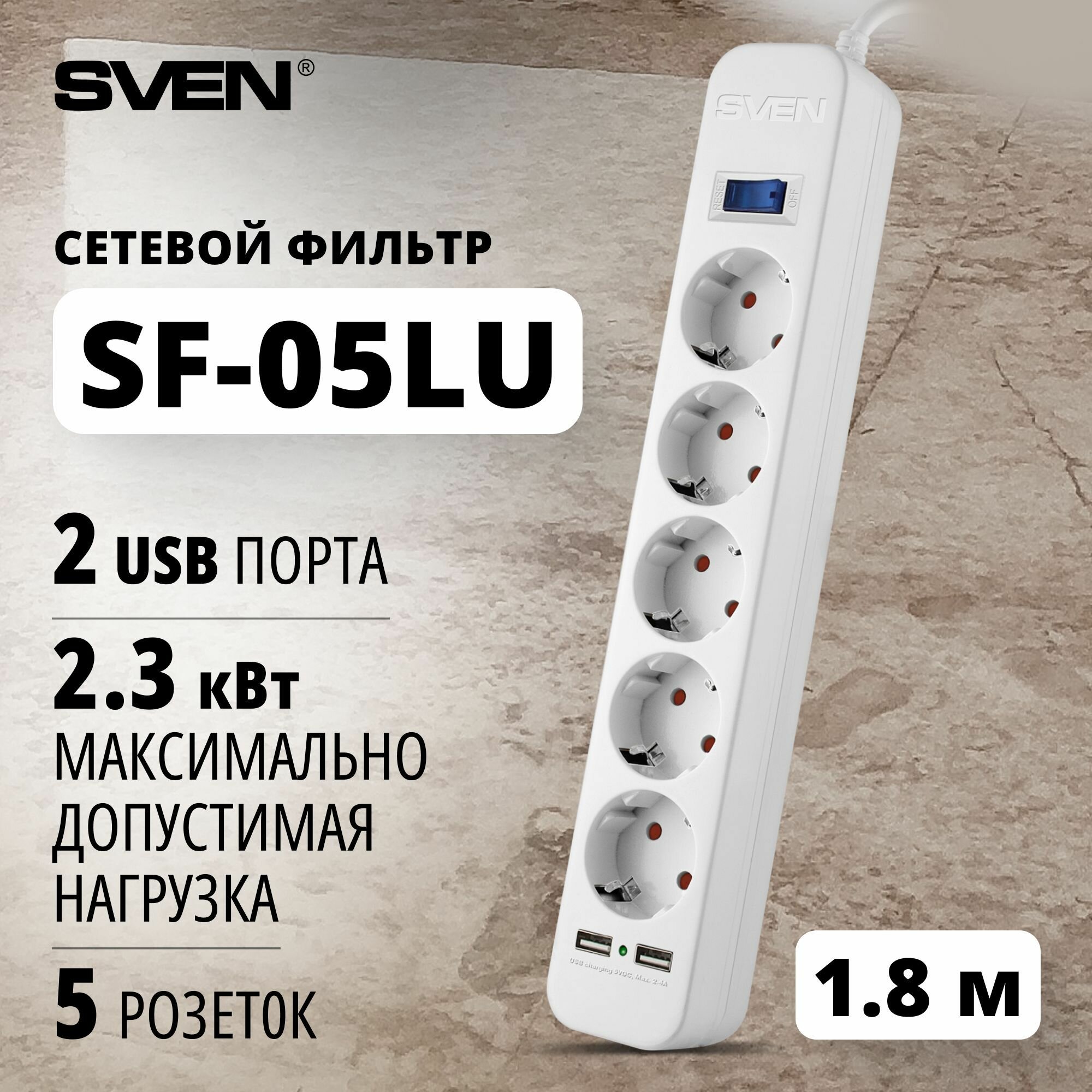 Сетевой фильтр Sven Sf-05lu 1.8 м (5 розеток, 2xUSB) белый (sv-017392)
