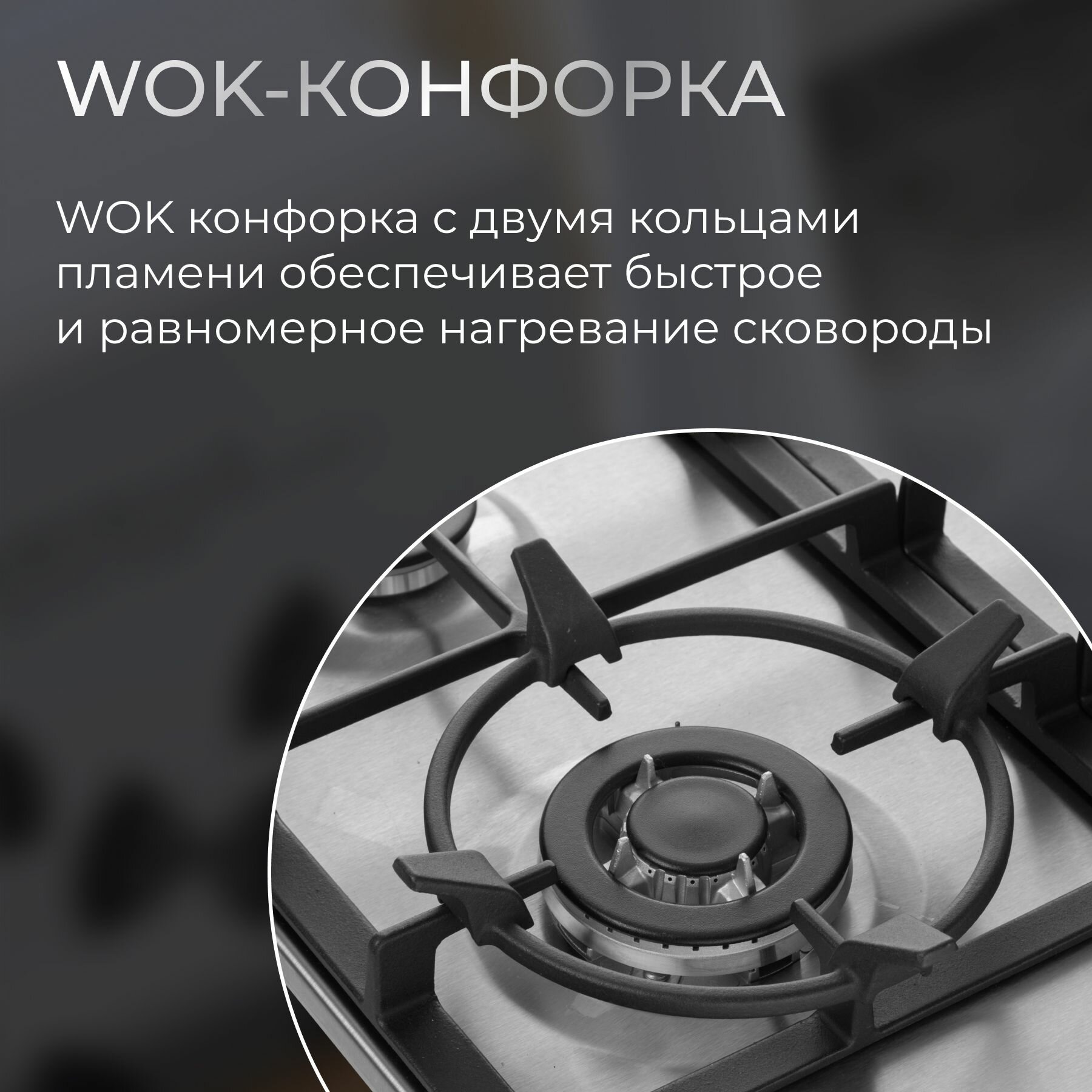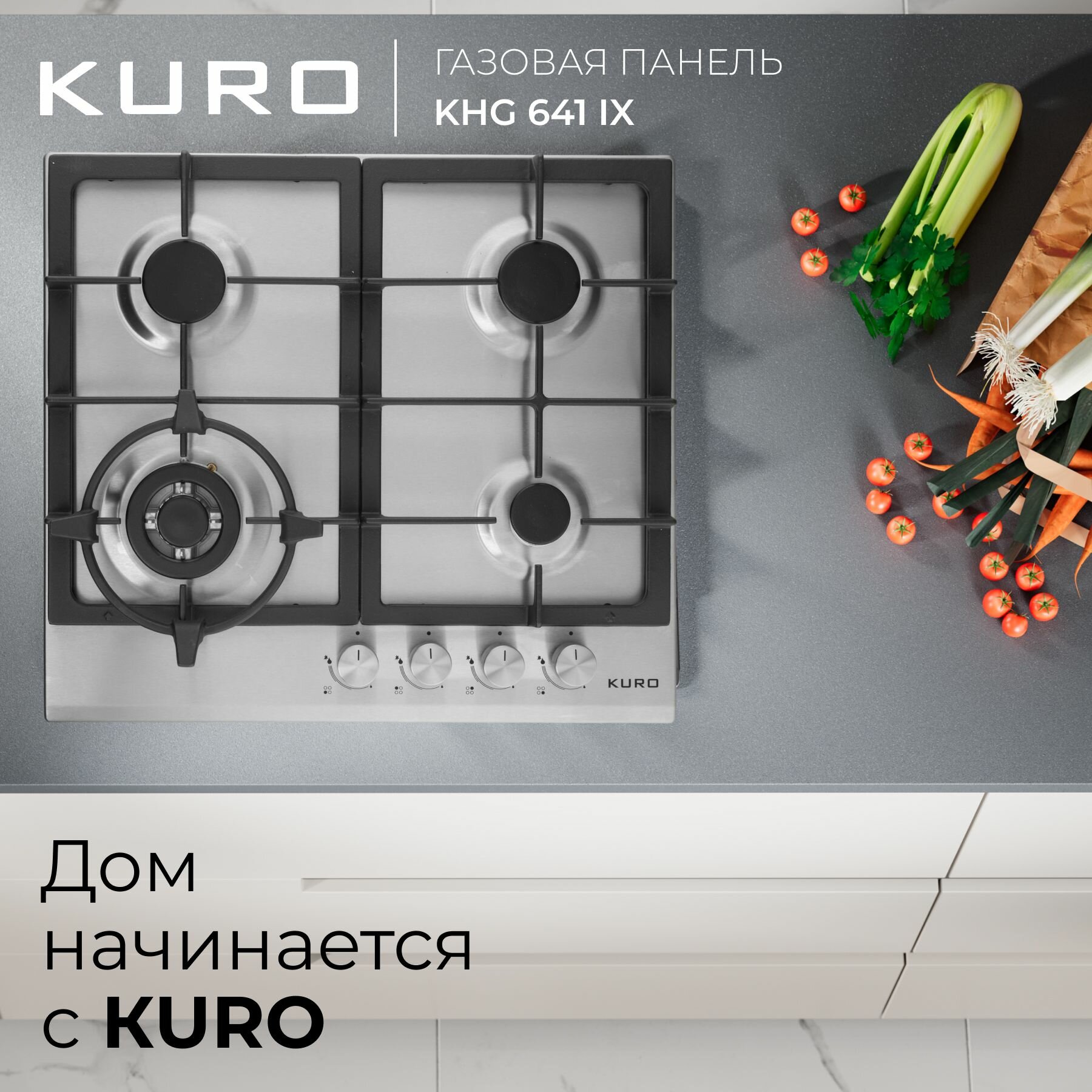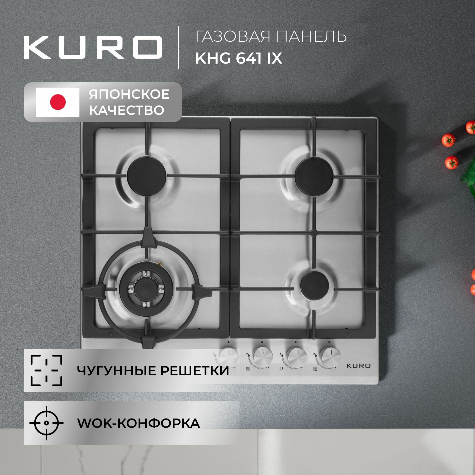 Газовая встраиваемая варочная панель 60 см KURO KHG 641 IX, газ-контроль, электроподжиг, WOK-конфорка, чугунные решетки, серебристая интересное: