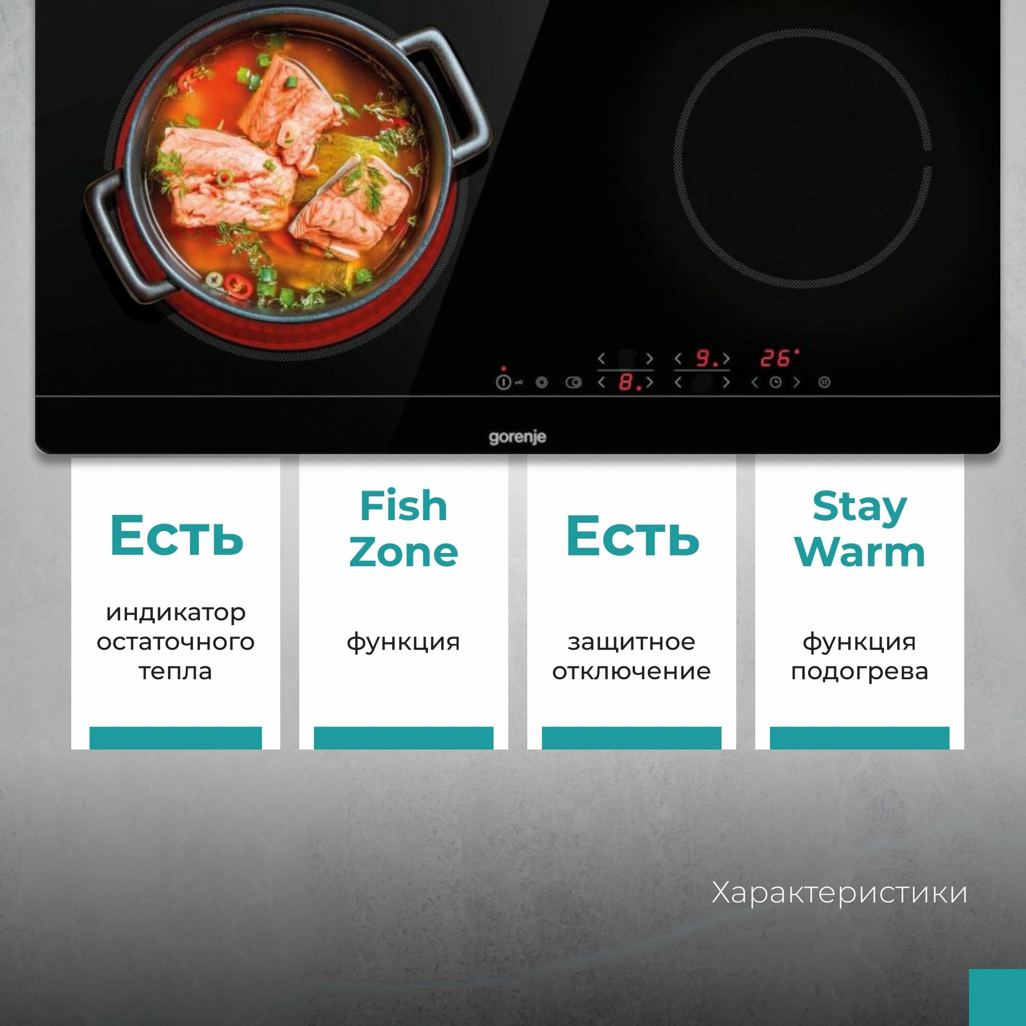 | Безопасность | защитное отключение конфорок / индикатор остаточного тепла / кнопка блокировки панели |