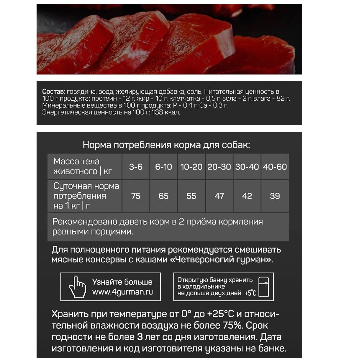 Четвероногий гурман 1шт по 340г Golden Line Говядина натуральная в желе консервы для собак