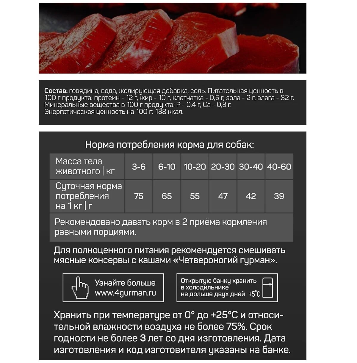 | Состав | говядина, желирующая добавка, соль, вода питьевая |