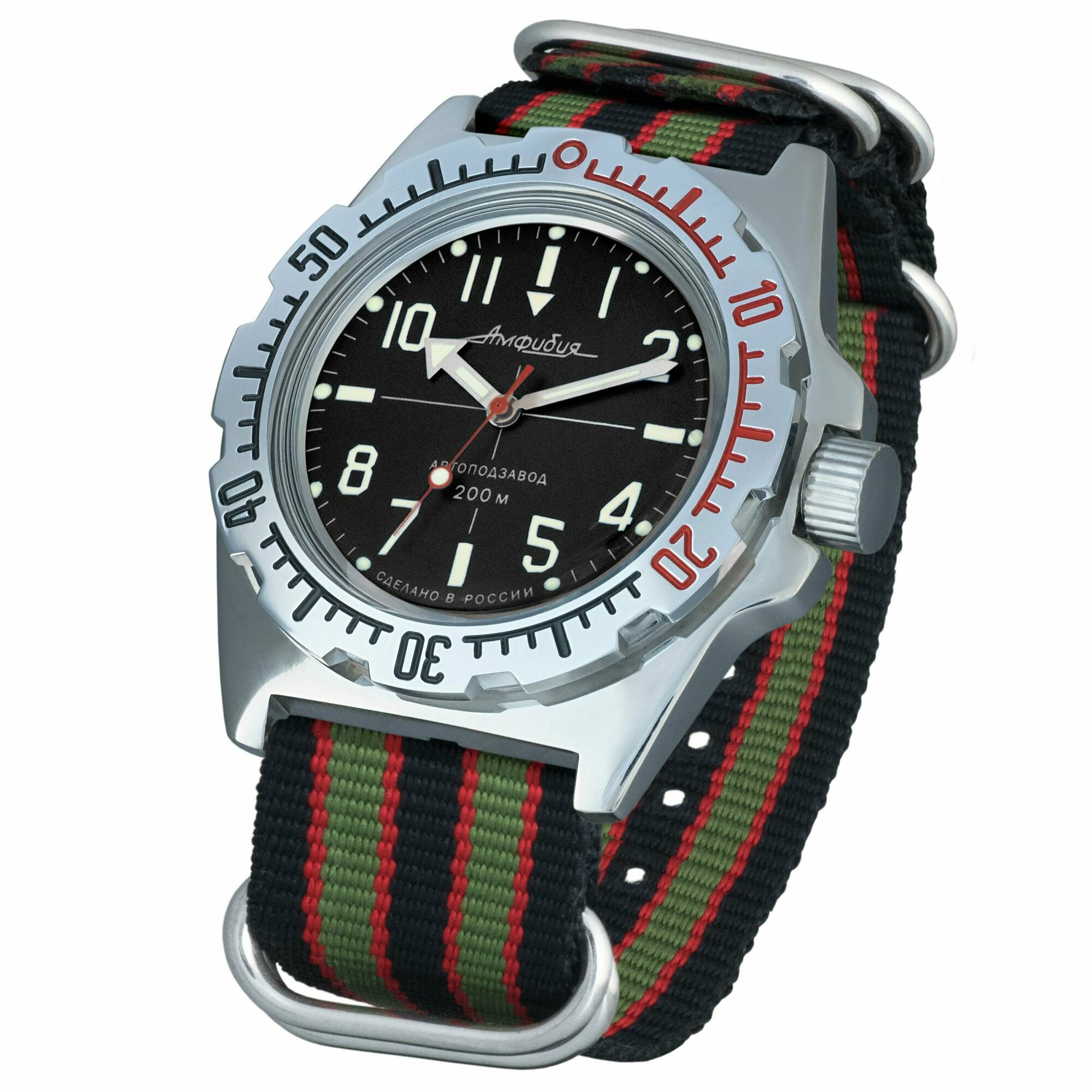 Часы наручные мужские механические с автоподзаводом Восток Амфибия 110647_black_red, нейлон, красный/черный