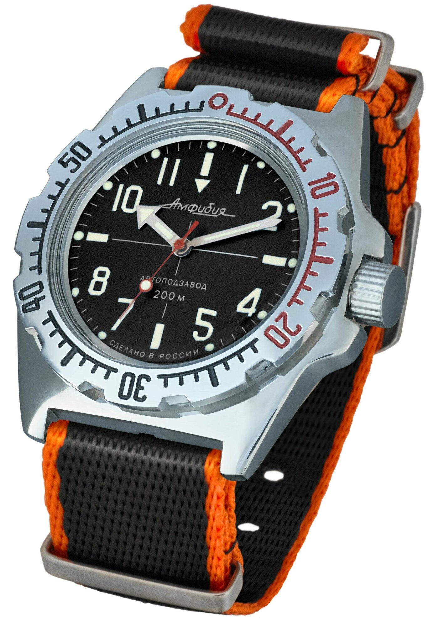 Часы наручные мужские механические с автоподзаводом Восток Амфибия 110647_black_orange, нейлон, оранжевый/черный