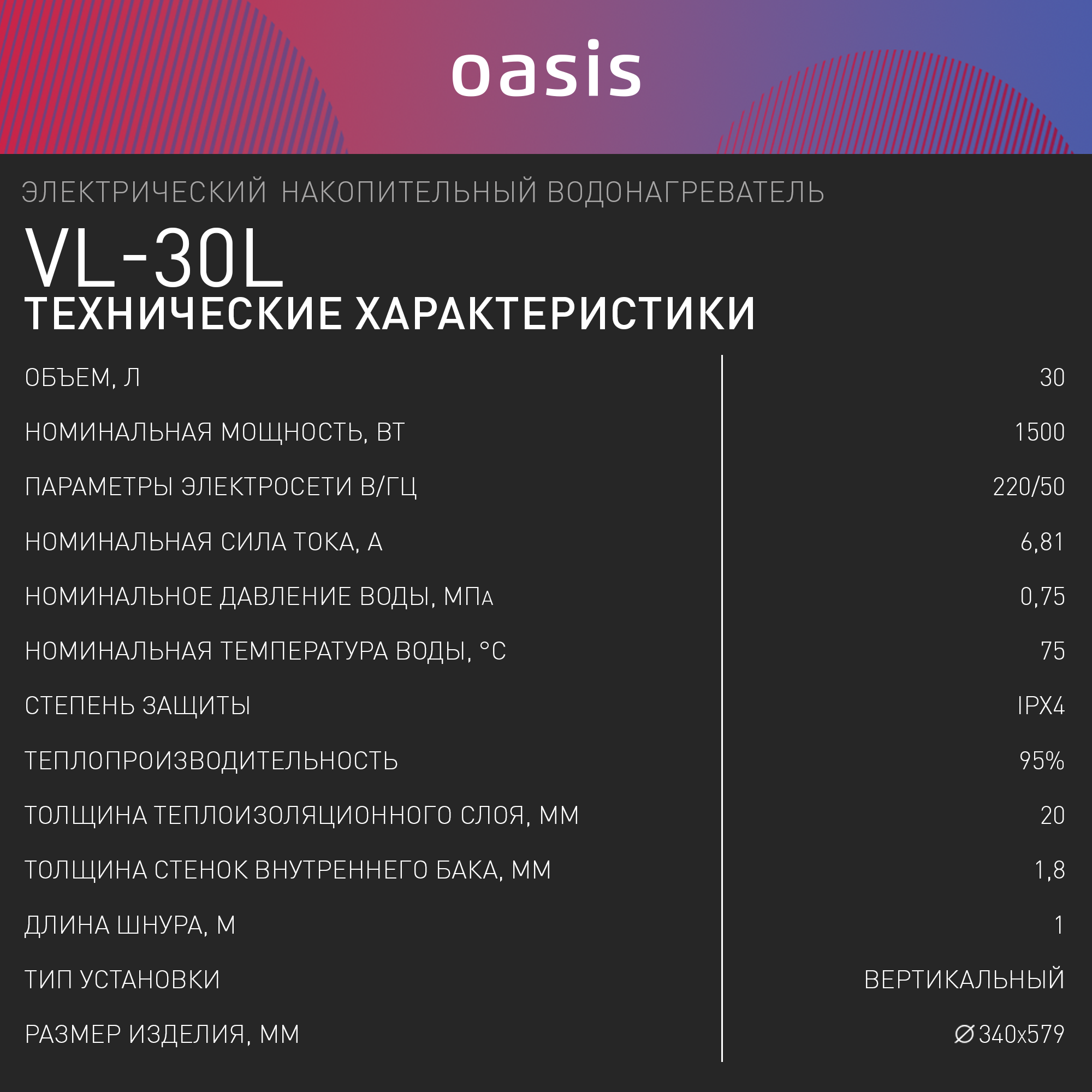 Купить Водонагреватель накопительный электрический Oasis VL-30L, бойлер для воды, 1500 Вт, 30 литров